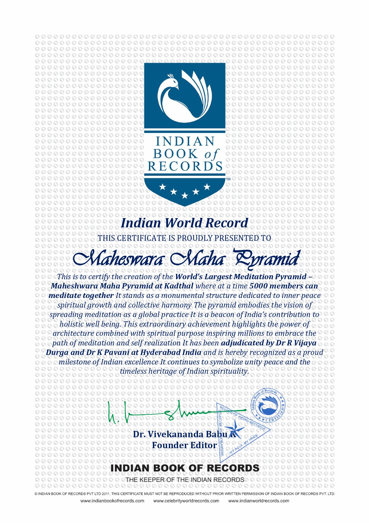 This is to certify the creation of the World’s Largest Meditation Pyramid-Maheshwara Maha Pyramid at Kadthal where at a time 5000 members can meditate together It stands as a monumental structure dedicated to inner peace spiritual growth and collective harmony The pyramid embodies the vision of spreading meditation as a global practice It is a beacon of India’s contribution to holistic well being.