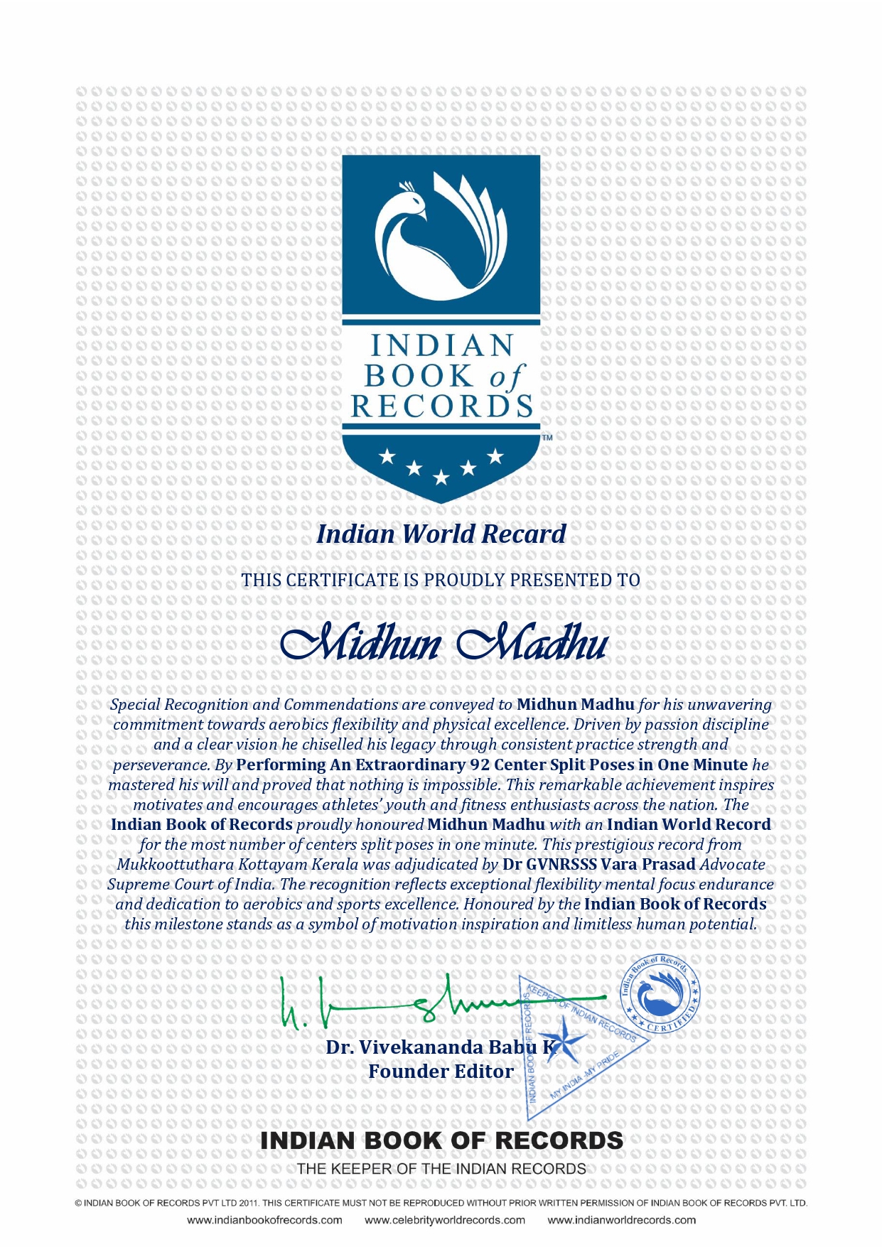 Special Recognition and Commendations are conveyed to Midhun Madhu for his unwavering commitment towards aerobics flexibility and physical excellence Driven by passion discipline and a clear vision he chiselled his legacy through consistent practice strength and perseverance By performing an extraordinary 92 center split poses in one minute he mastered his will and proved that nothing is impossible This remarkable achievement inspires motivates and encourages athletes youth and fitness enthusiasts across the nation.
