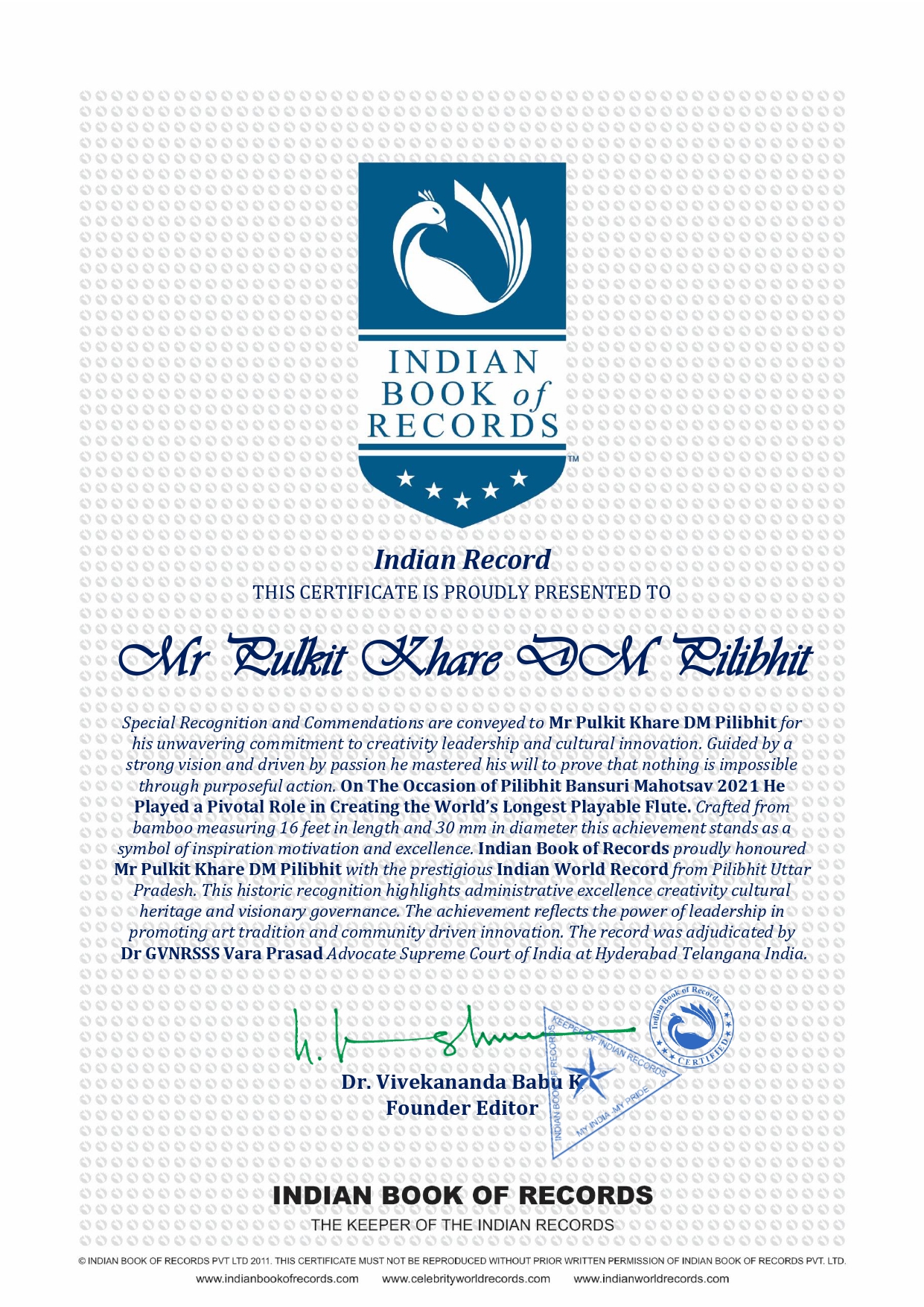 Indian Book of Records proudly honoured Mr Pulkit Khare DM Pilibhit with the prestigious Indian World Record from Pilibhit Uttar Pradesh This historic recognition highlights administrative excellence creativity cultural heritage and visionary governance The achievement reflects the power of leadership in promoting art tradition and community driven innovation The record was adjudicated by Dr GVNRSSS Vara Prasad Advocate Supreme Court of India at Hyderabad Telangana India.