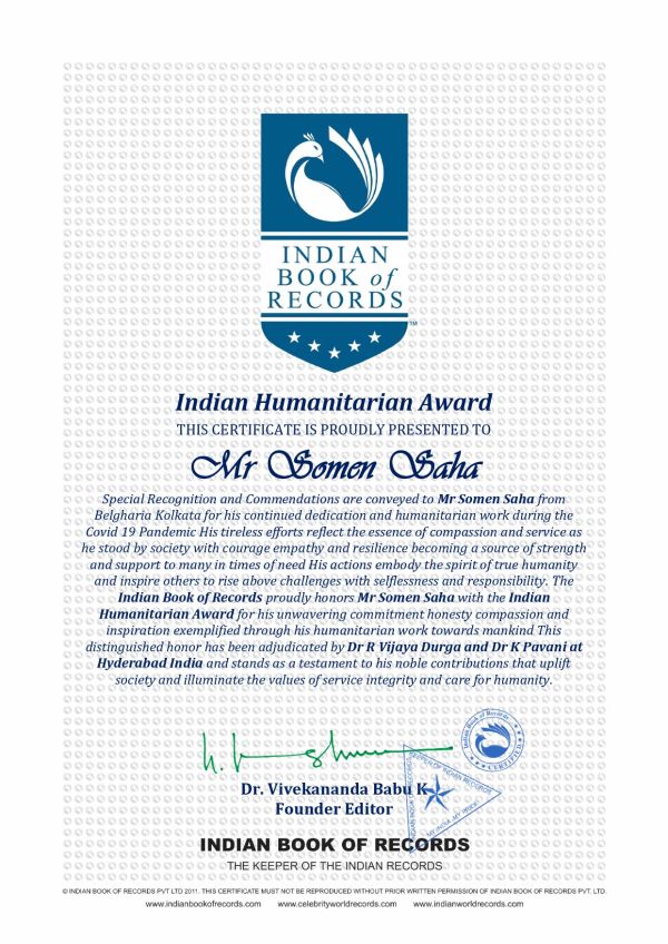 Special Recognition and Commendations are conveyed to Mr Somen Saha from Belgharia Kolkata for his continued dedication and humanitarian work during the Covid 19 Pandemic His tireless efforts reflect the essence of compassion and service as he stood by society with courage empathy and resilience becoming a source of strength and support to many in times of need His actions embody the spirit of true humanity and inspire others to rise above challenges with selflessness and responsibility.