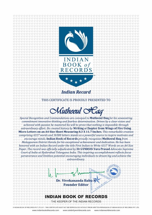 Special Recognition and Commendations are conveyed to Mutheeul Haq for his unwavering commitment innovative thinking and fearless determination Driven by a clear vision and achieved with passion he mastered his will to prove that nothing is impossible through extraordinary effort He created history by writing a chapter from Wings of Fire using micro letters on an A4 size sheet measuring 8.3 X 11.7 inches This remarkable creation comprising 6317 words and 36580 letters stands as a powerful source to inspire motivate and encourage minds.