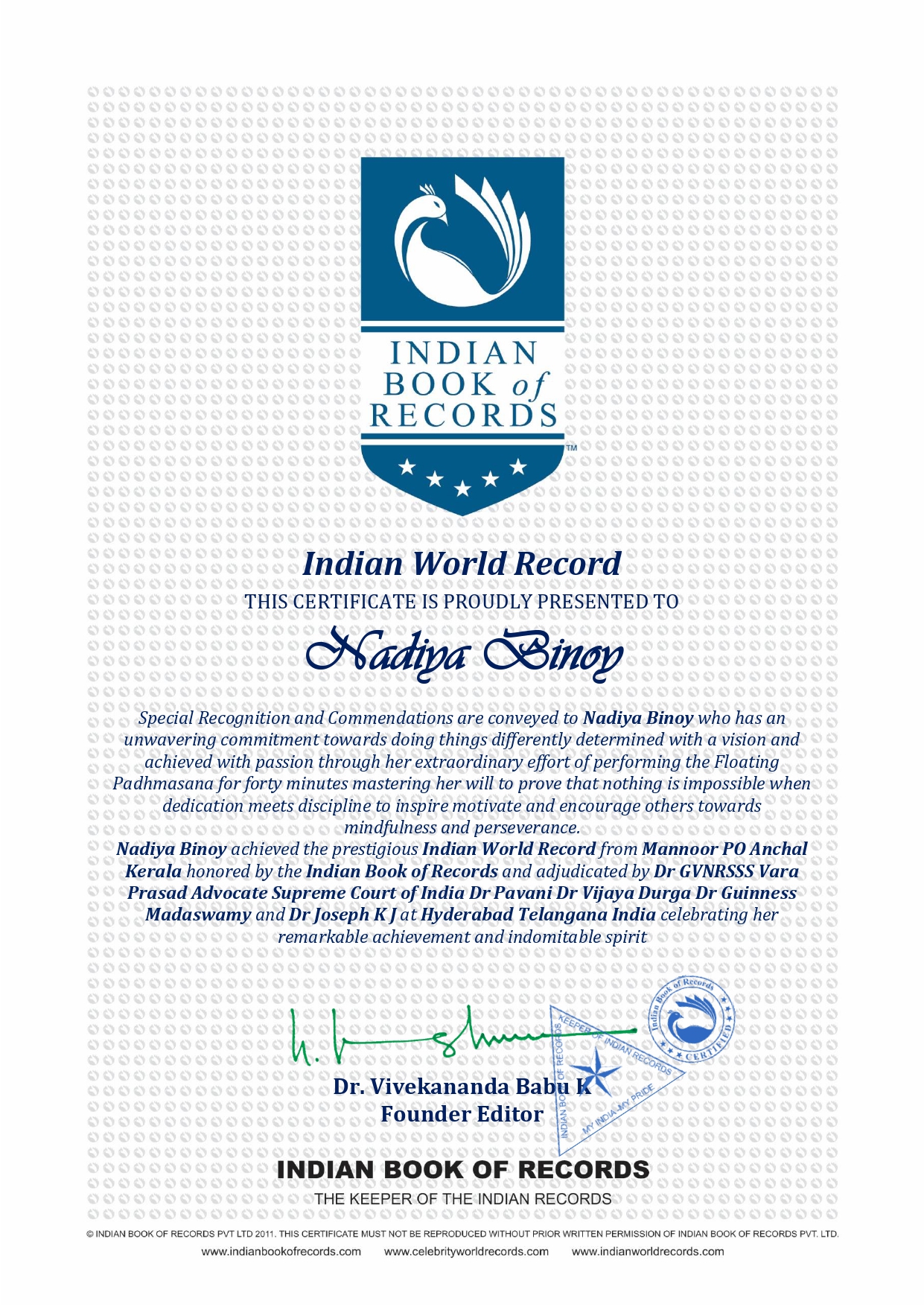 Nadiya Binoy achieved the prestigious Indian World Record from Mannoor PO Anchal Kerala honored by the Indian Book of Records and adjudicated by Dr GVNRSSS Vara Prasad Advocate Supreme Court of India Dr Pavani Dr Vijaya Durga Dr Guinness Madaswamy and Dr Joseph K J at Hyderabad Telangana India celebrating her remarkable achievement and indomitable spirit.