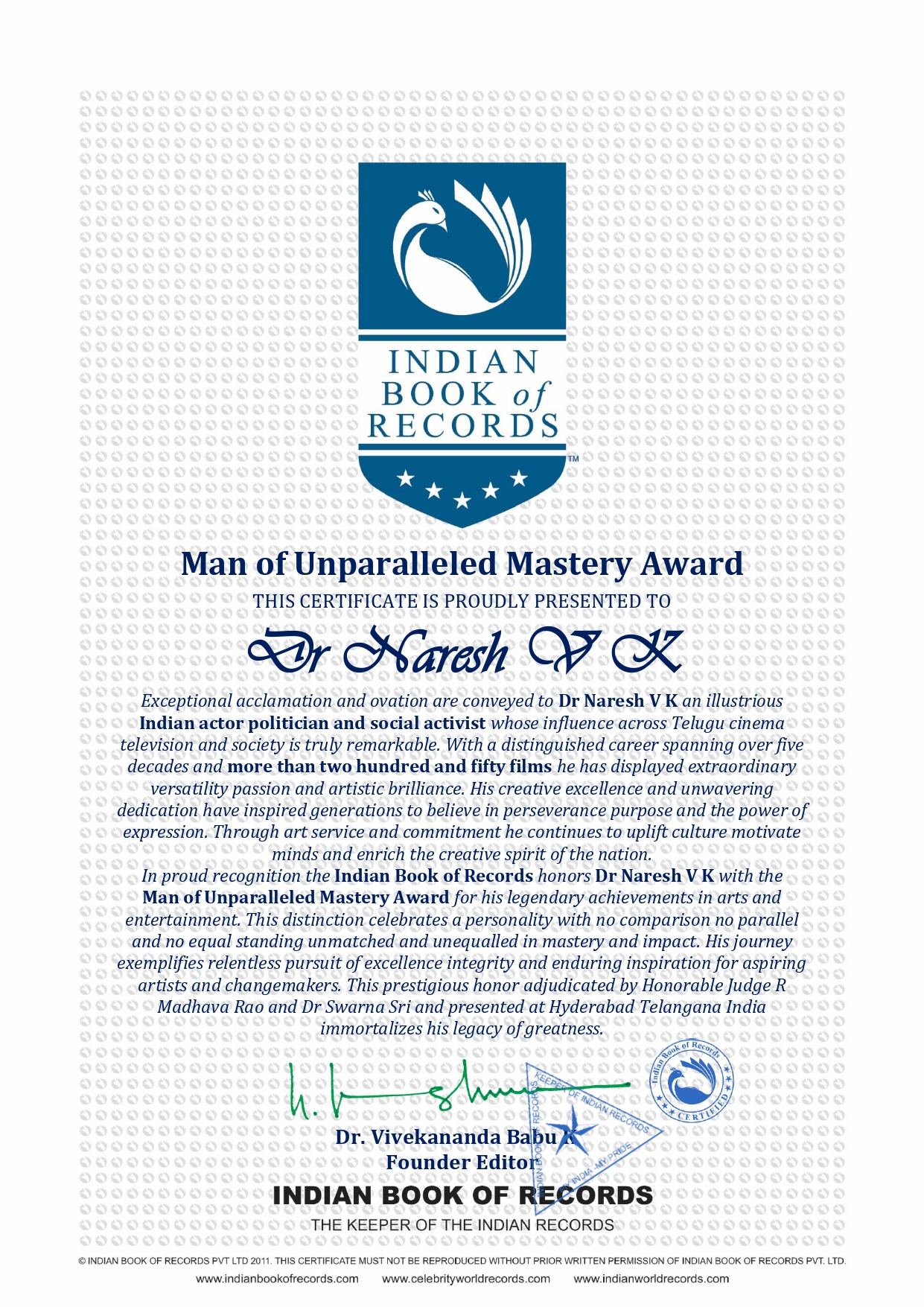 In proud recognition the Indian Book of Records honors Dr Naresh V K with the Man of Unparalleled Mastery Award for his legendary achievements in arts and entertainment