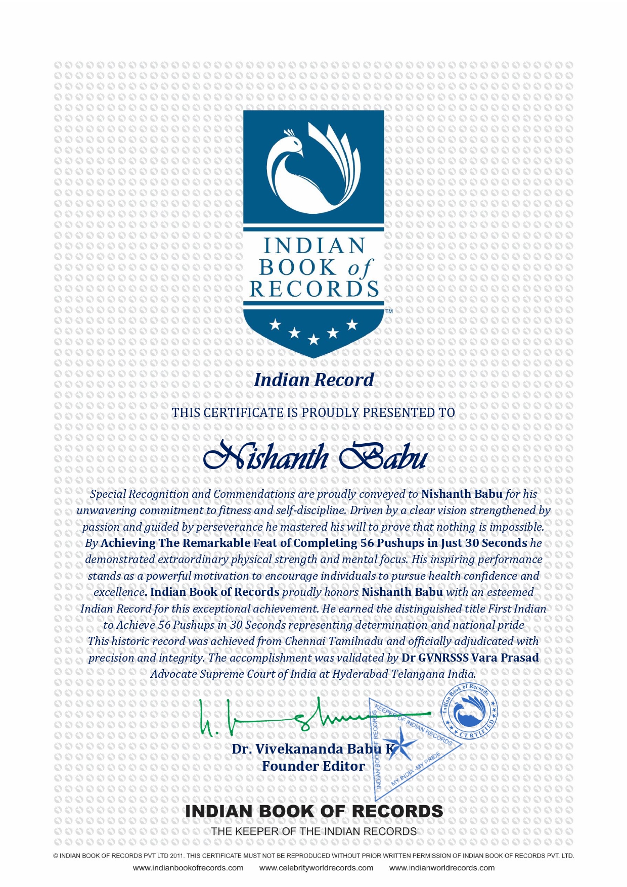 Indian Book of Records proudly honors Nishanth Babu with an esteemed Indian Record for this exceptional achievement He earned the distinguished title First Indian to Achieve 56 Pushups in 30 Seconds representing determination and national pride This historic record was achieved from Chennai Tamilnadu and officially adjudicated with precision and integrity The accomplishment was validated by Dr GVNRSSS Vara Prasad Advocate Supreme Court of India at Hyderabad Telangana India.