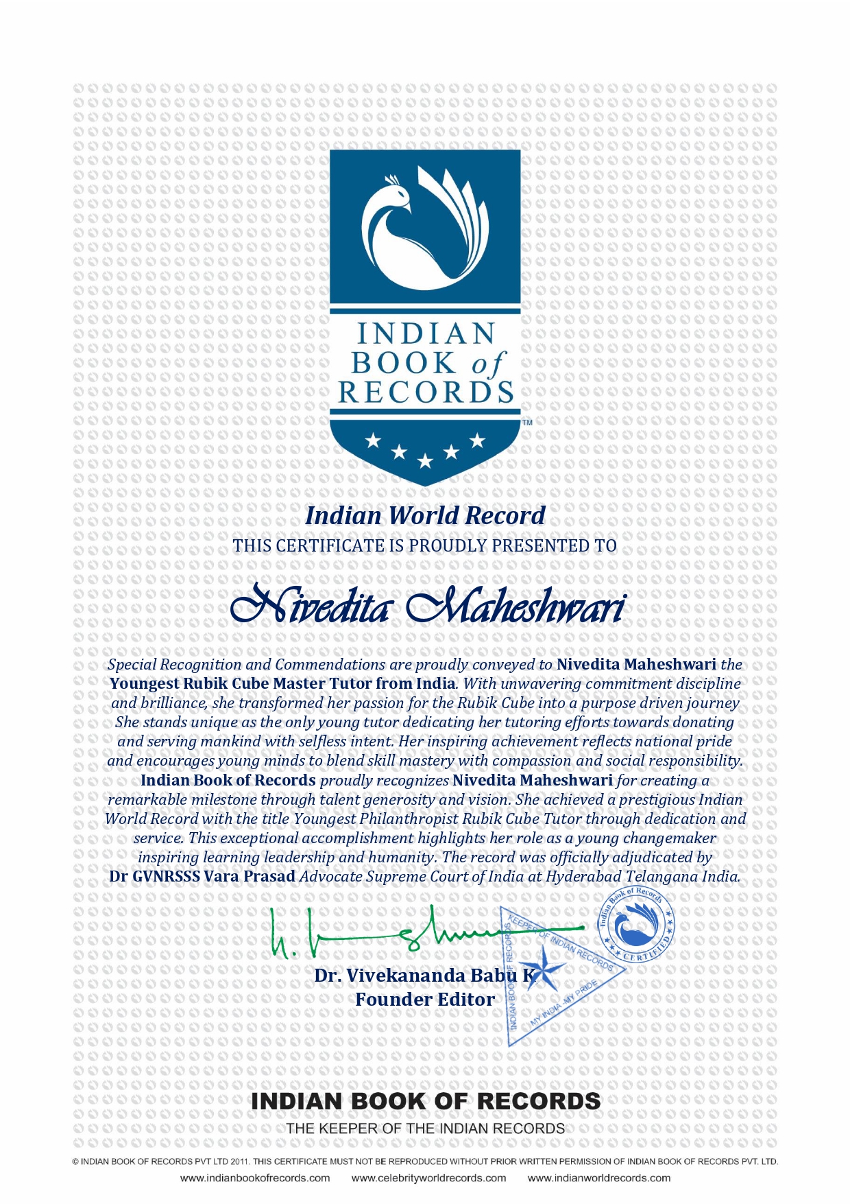 Indian Book of Records proudly recognizes Nivedita Maheshwari for creating a remarkable milestone through talent generosity and vision She achieved a prestigious Indian World Record with the title Youngest Philanthropist Rubik Cube Tutor through dedication and service This exceptional accomplishment highlights her role as a young changemaker inspiring learning leadership and humanity The record was officially adjudicated by Dr GVNRSSS Vara Prasad Advocate Supreme Court of India at Hyderabad Telangana India.