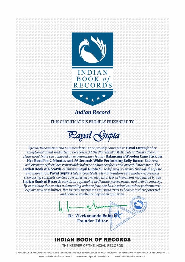 Special Recognition and Commendations are proudly conveyed to Payal Gupta for her exceptional talent and artistic excellence At the Naadhkulla Multi Talent Reality Show in Hyderabad India she achieved an extraordinary feat by balancing a wooden cane stick on her head for 2 minutes and 56 seconds while performing belly dance This rare achievement reflects her remarkable balance endurance focus and graceful movement The Indian Book of Records celebrates Payal Gupta for redefining creativity through discipline and innovation.