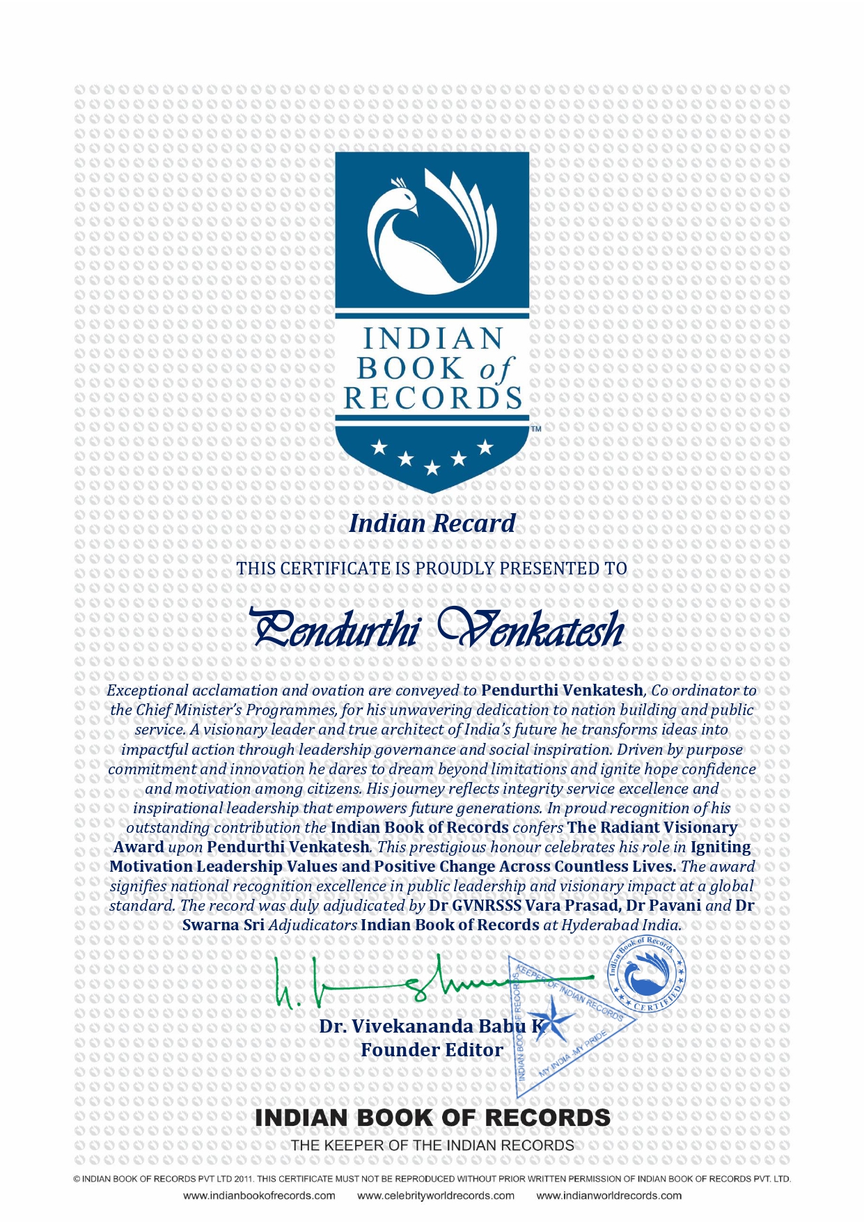 In proud recognition of his outstanding contribution the Indian Book of Records confers The Radiant Visionary Award upon Pendurthi Venkatesh This prestigious honour celebrates his role in igniting motivation leadership values and positive change across countless lives The award signifies national recognition excellence in public leadership and visionary impact at a global standard The record was duly adjudicated by Dr GVNRSSS Vara Prasad Dr Pavani and Dr Swarna Sri Adjudicators Indian Book of Records at Hyderabad India.