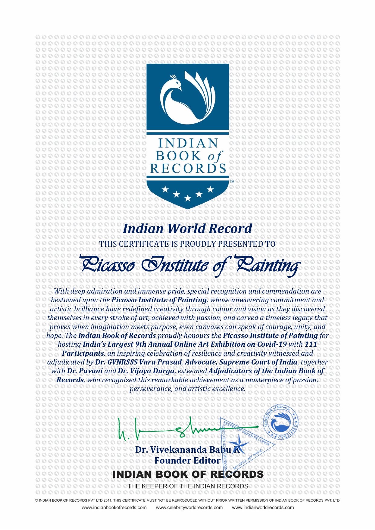 The Indian Book of Records proudly honours the Picasso Institute of Painting for hosting India’s Largest 9th Annual Online Art Exhibition on Covid-19 with 111 Participants, an inspiring celebration of resilience and creativity witnessed and adjudicated by Dr. GVNRSSS Vara Prasad, Advocate, Supreme Court of India, together with Dr. Pavani and Dr. Vijaya Durga, esteemed Adjudicators of the Indian Book of Records, who recognized this remarkable achievement as a masterpiece of passion, perseverance, and artistic excellence.