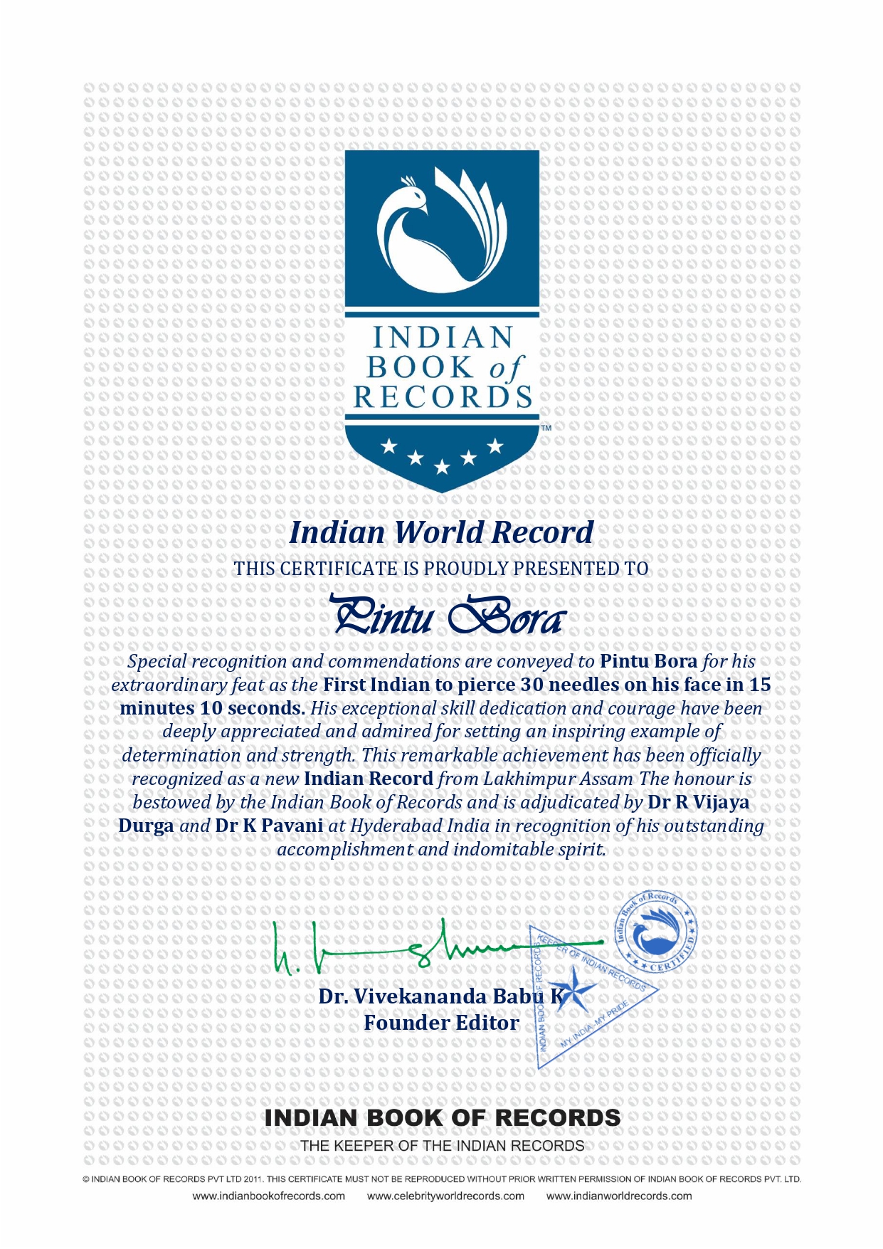 Special recognition and commendations are conveyed to Pintu Bora for his extraordinary feat as the First Indian to pierce 30 needles on his face in 15 minutes 10 seconds His exceptional skill dedication and courage have been deeply appreciated and admired for setting an inspiring example of determination and strength.This remarkable achievement has been officially recognized as a new Indian Record from Lakhimpur Assam The honour is bestowed by the Indian Book of Records and is adjudicated by Dr R Vijaya Durga and Dr K Pavani at Hyderabad India in recognition of his outstanding accomplishment and indomitable spirit.