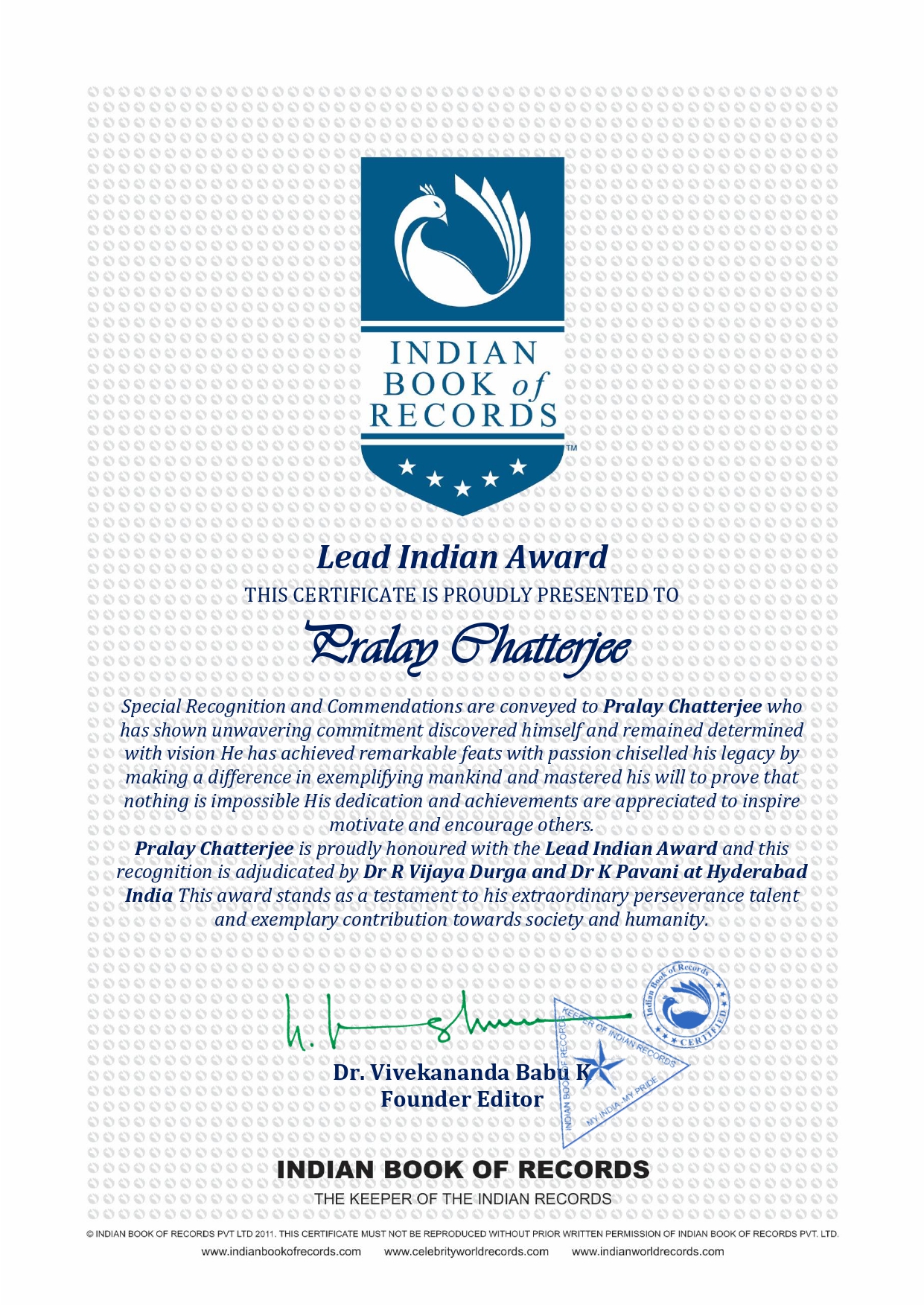Pralay Chatterjee is proudly honoured with the Lead Indian Award and this recognition is adjudicated by Dr R Vijaya Durga and Dr K Pavani at Hyderabad India This award stands as a testament to his extraordinary perseverance talent and exemplary contribution towards society and humanity.