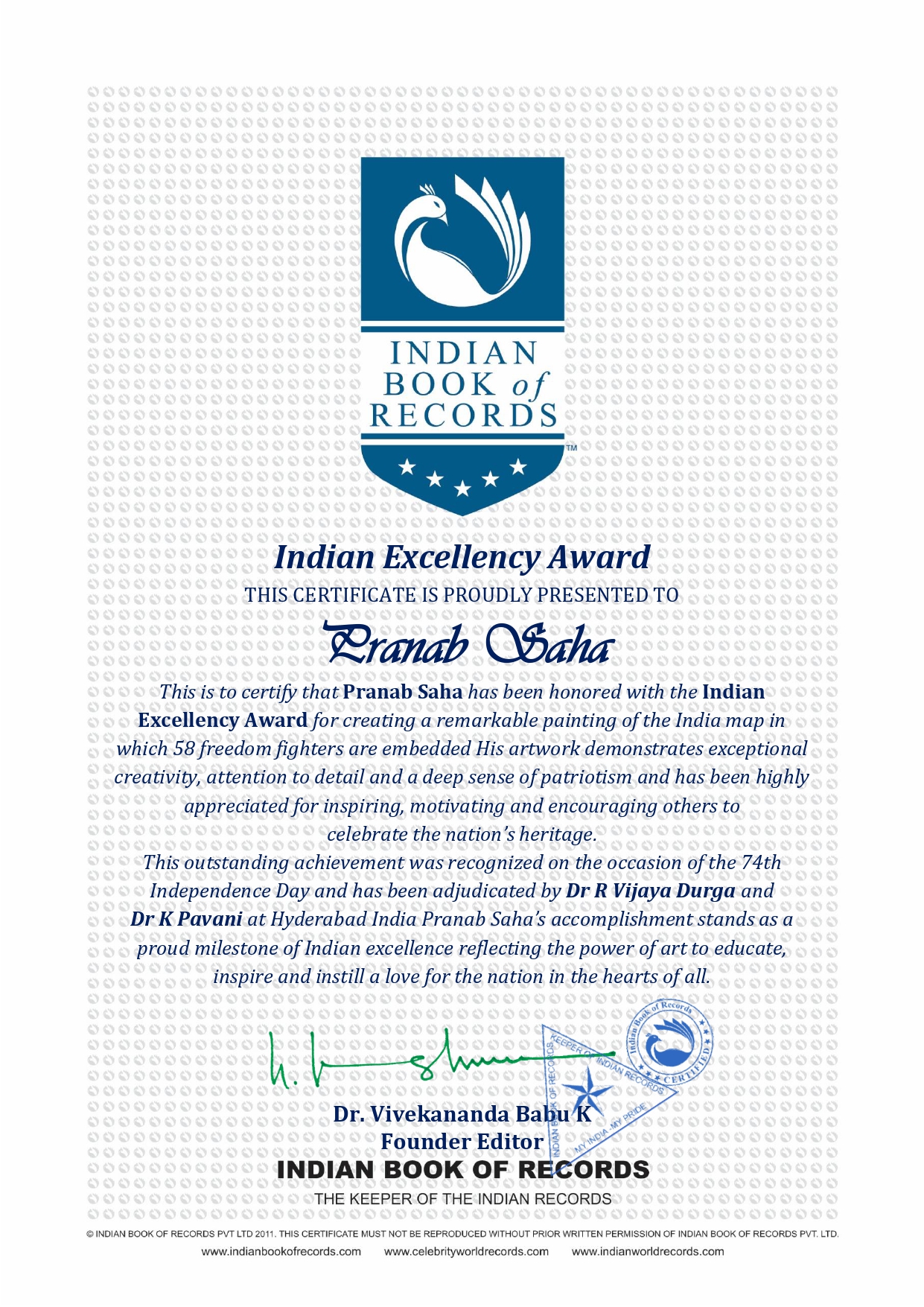 This is to certify that Pranab Saha has been honored with the Indian Excellency Award for creating a remarkable painting of the India map in which 58 freedom fighters are embedded His artwork demonstrates exceptional creativity, attention to detail and a deep sense of patriotism and has been highly appreciated for inspiring, motivating and encouraging others to celebrate the nation’s heritage.