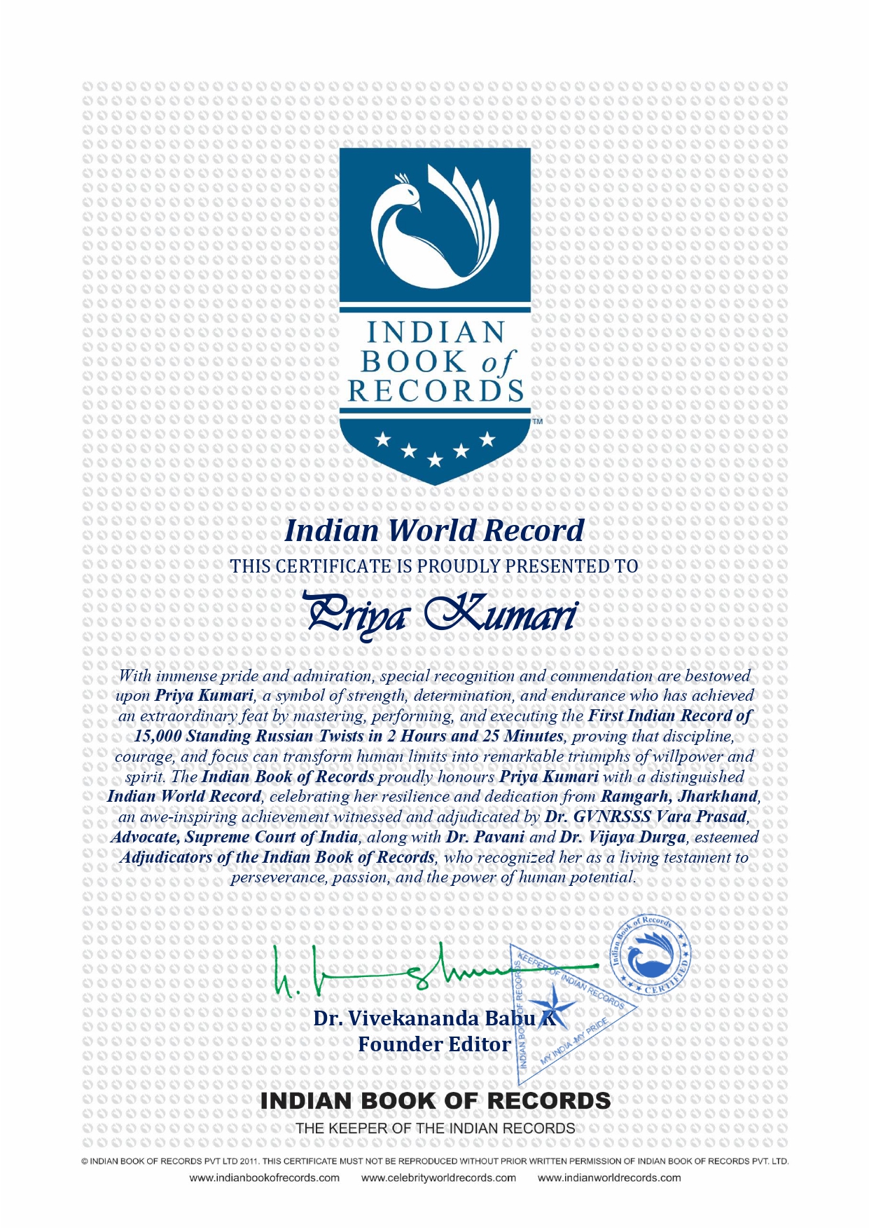 With immense pride and admiration, special recognition and commendation are bestowed upon Priya Kumari, a symbol of strength, determination, and endurance who has achieved an extraordinary feat by mastering, performing, and executing the First Indian Record of 15,000 Standing Russian Twists in 2 Hours and 25 Minutes, proving that discipline, courage, and focus can transform human limits into remarkable triumphs of willpower and spirit.