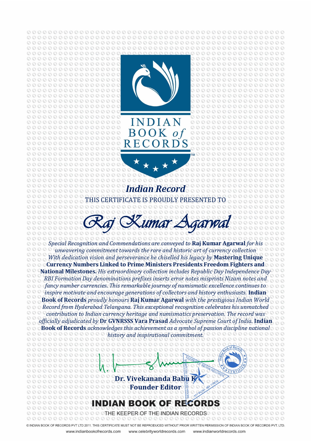 Indian Book of Records proudly honours Raj Kumar Agarwal with the prestigious Indian World Record from Hyderabad Telangana This exceptional recognition celebrates his unmatched contribution to Indian currency heritage and numismatics preservation The record was officially adjudicated by Dr GVNRSSS Vara Prasad Advocate Supreme Court of India Indian Book of Records acknowledges this achievement as a symbol of passion discipline national history and inspirational commitment.