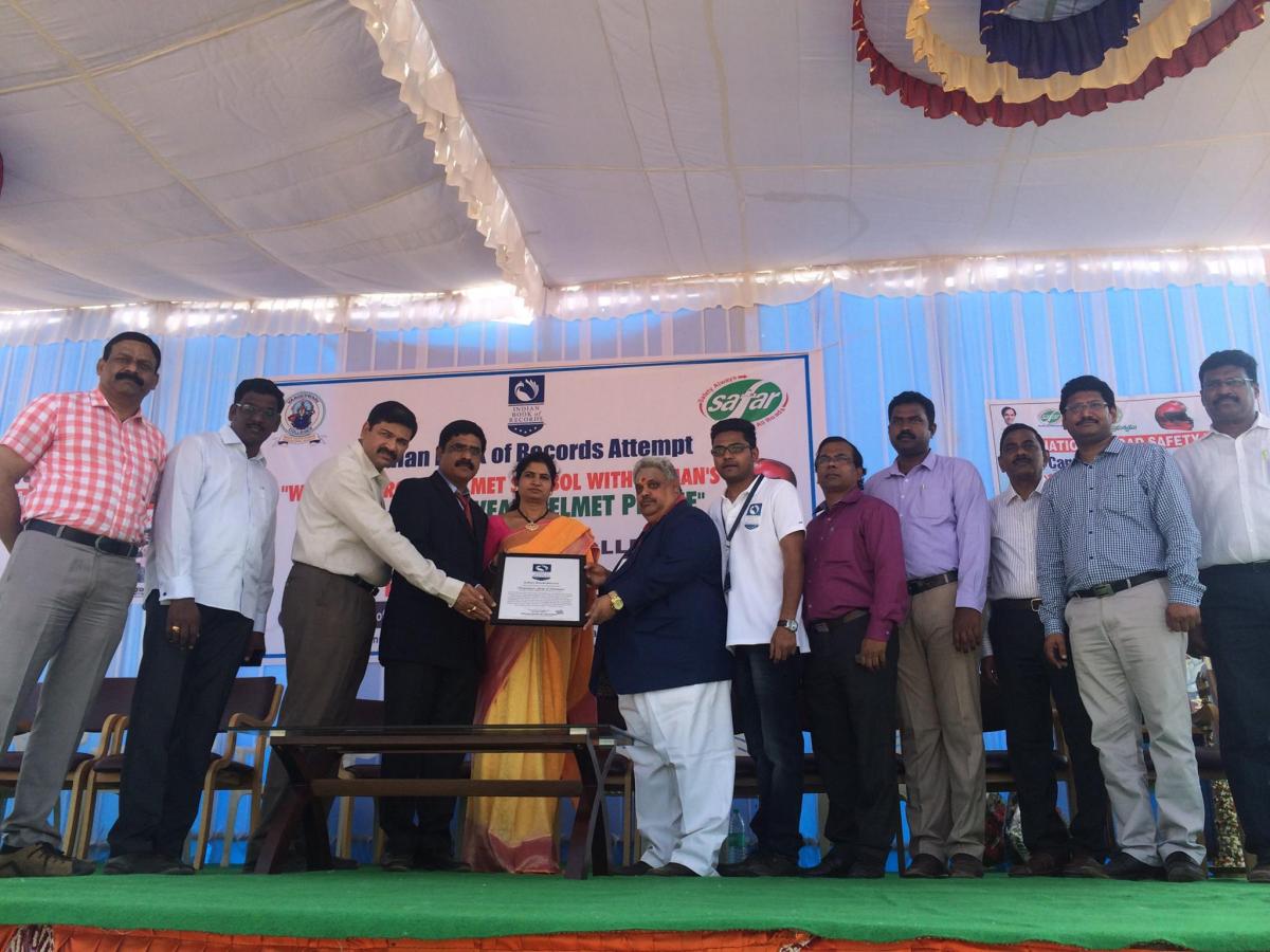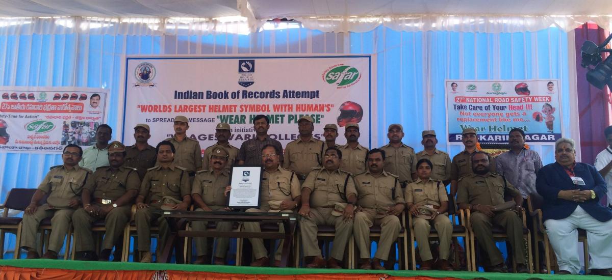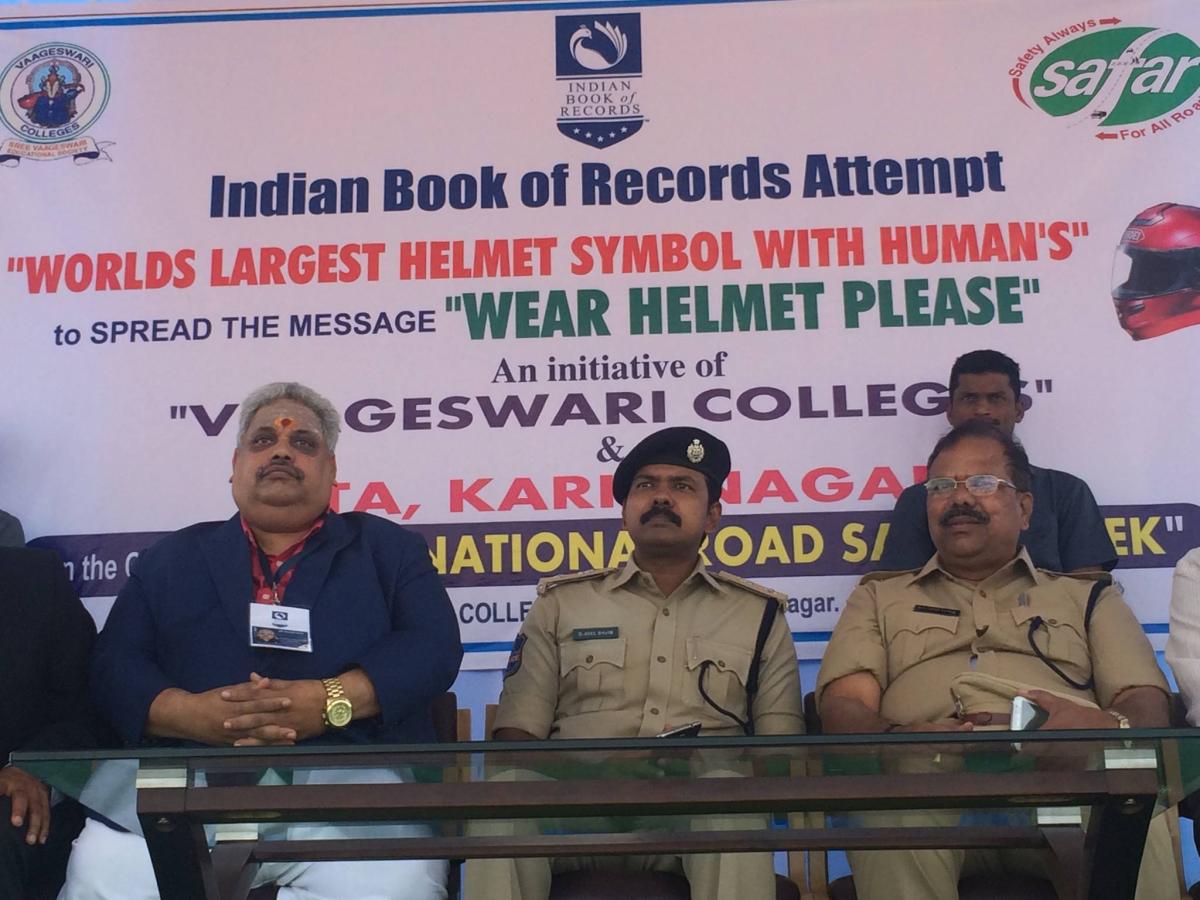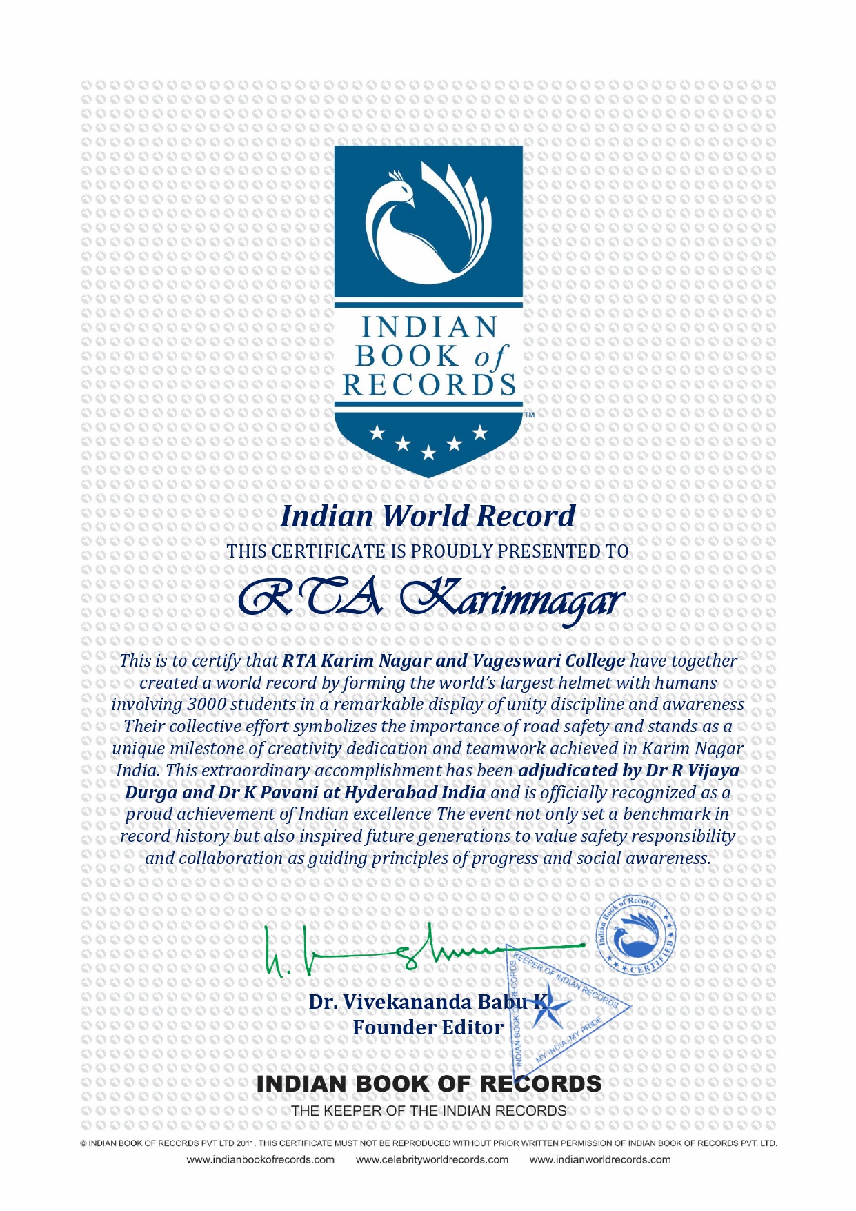 This is to certify that RTA Karim Nagar and Vageswari College have together created a world record by forming the worlds largest helmet with humans involving 3000 students in a remarkable display of unity discipline and awareness Their collective effort symbolizes the importance of road safety and stands as a unique milestone of creativity dedication and teamwork achieved in Karim Nagar India.