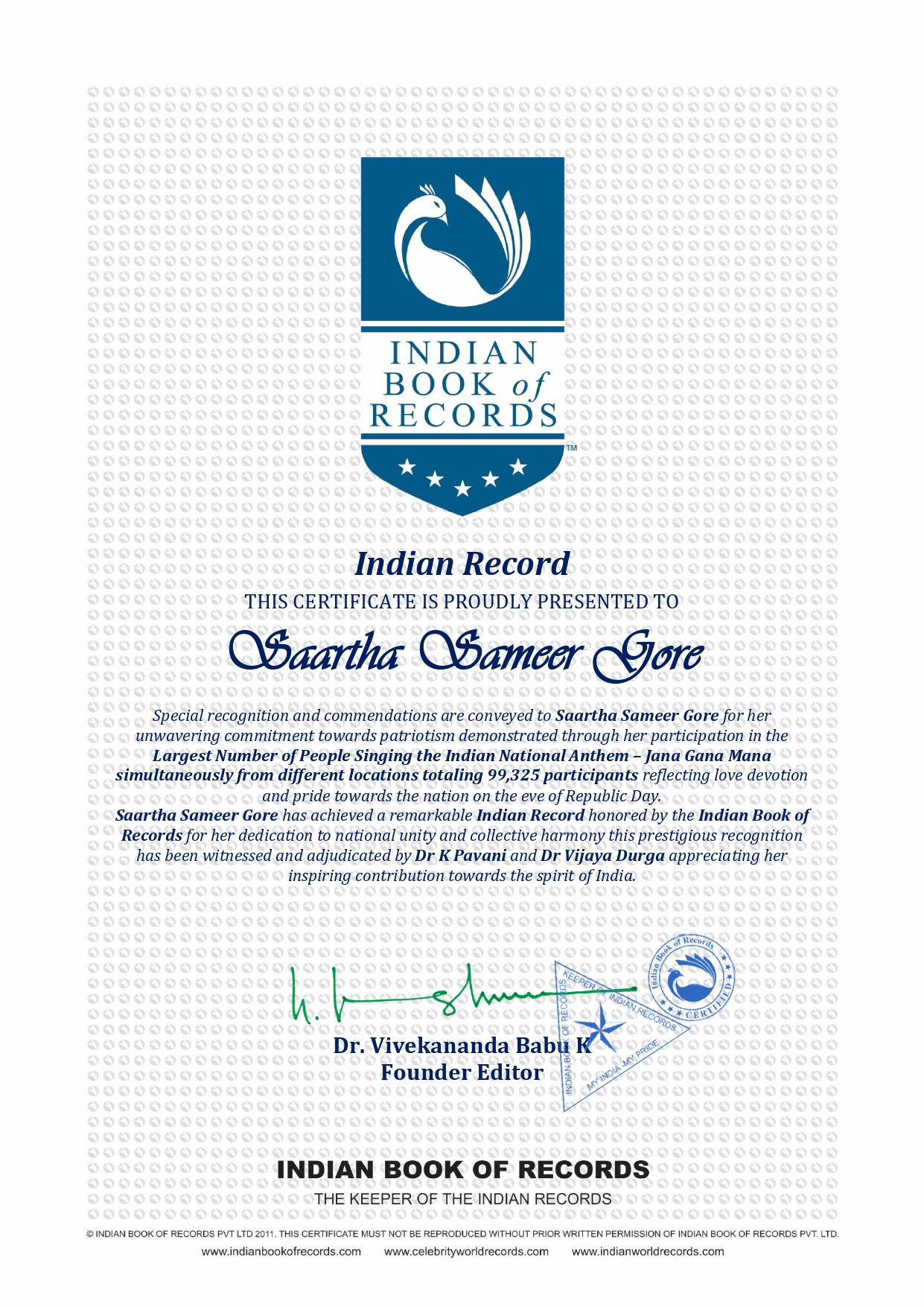 Special recognition and commendations are conveyed to Saartha Sameer Gore for her unwavering commitment towards patriotism demonstrated through her participation in the Largest Number of People Singing the Indian National Anthem – Jana Gana Mana simultaneously from different locations totaling 99,325 participants reflecting love devotion and pride towards the nation on the eve of Republic Day.