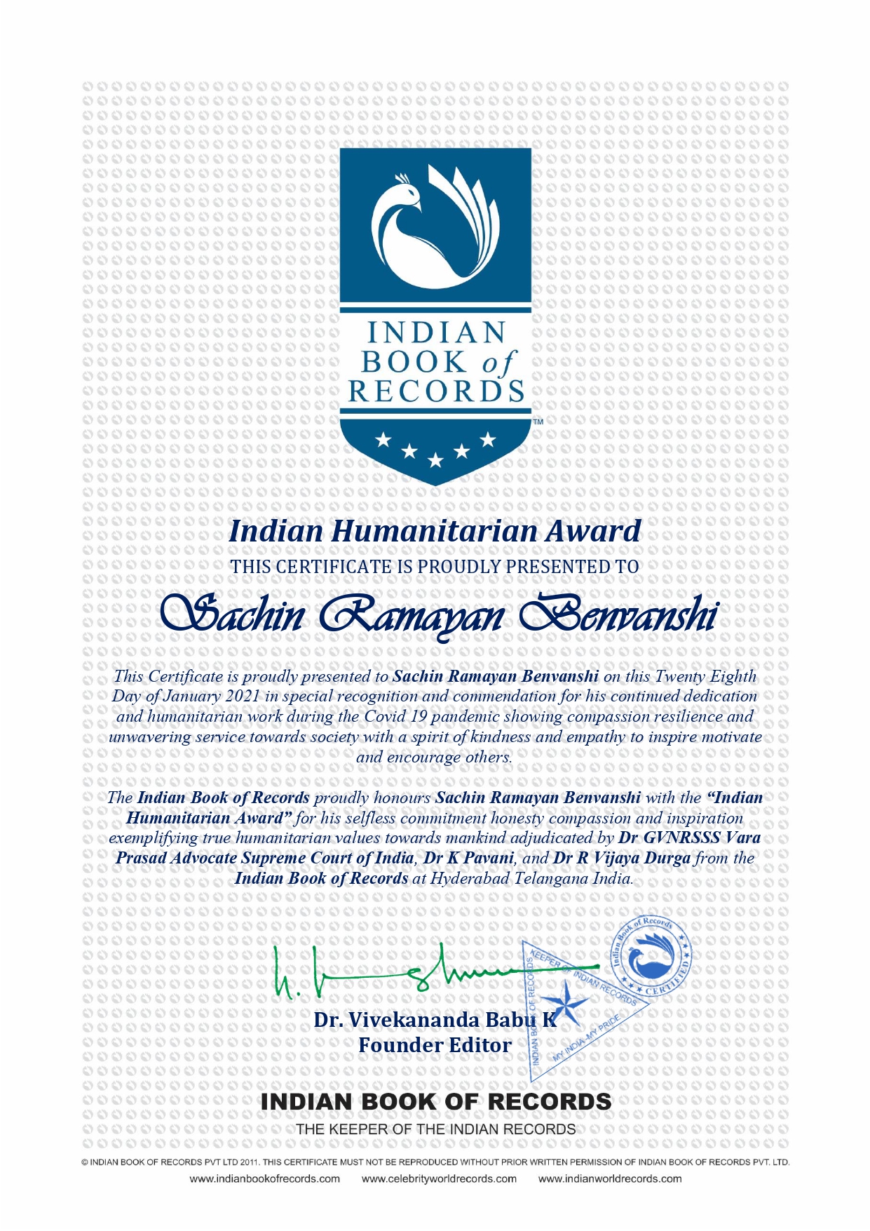 The Indian Book of Records proudly honours Sachin Ramayan Benvanshi with the “Indian Humanitarian Award” for his selfless commitment honesty compassion and inspiration exemplifying true humanitarian values towards mankind adjudicated by Dr GVNRSSS Vara Prasad Advocate Supreme Court of India, Dr K Pavani, and Dr R Vijaya Durga from the Indian Book of Records at Hyderabad Telangana India.