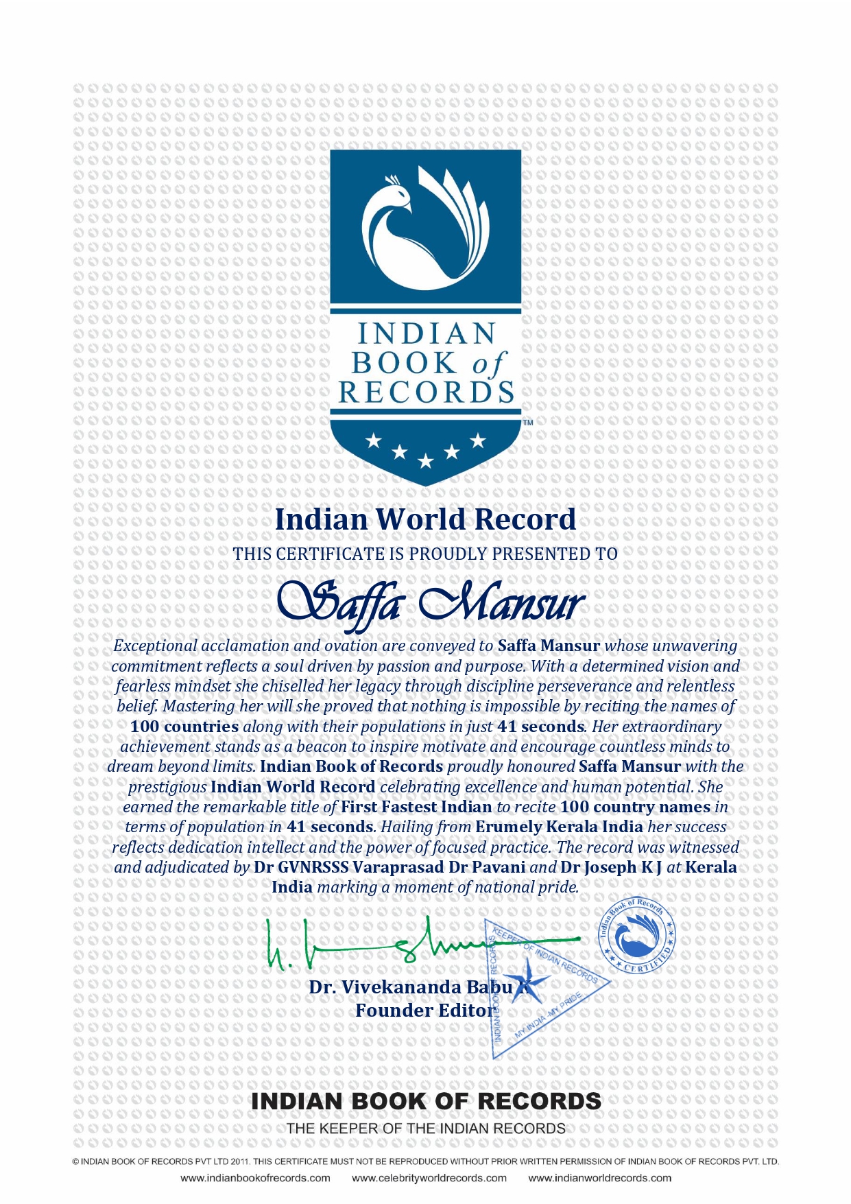 Indian Book of Records proudly honoured Saffa Mansur with the prestigious Indian World Record celebrating excellence and human potential She earned the remarkable title of First Fastest Indian to recite 100 country names in terms of population in 41 seconds Hailing from Erumely Kerala India her success reflects dedication intellect and the power of focused practice The record was witnessed and adjudicated by Dr GVNRSSS Varaprasad Dr Pavani and Dr Joseph K J at Kerala India marking a moment of national pride.