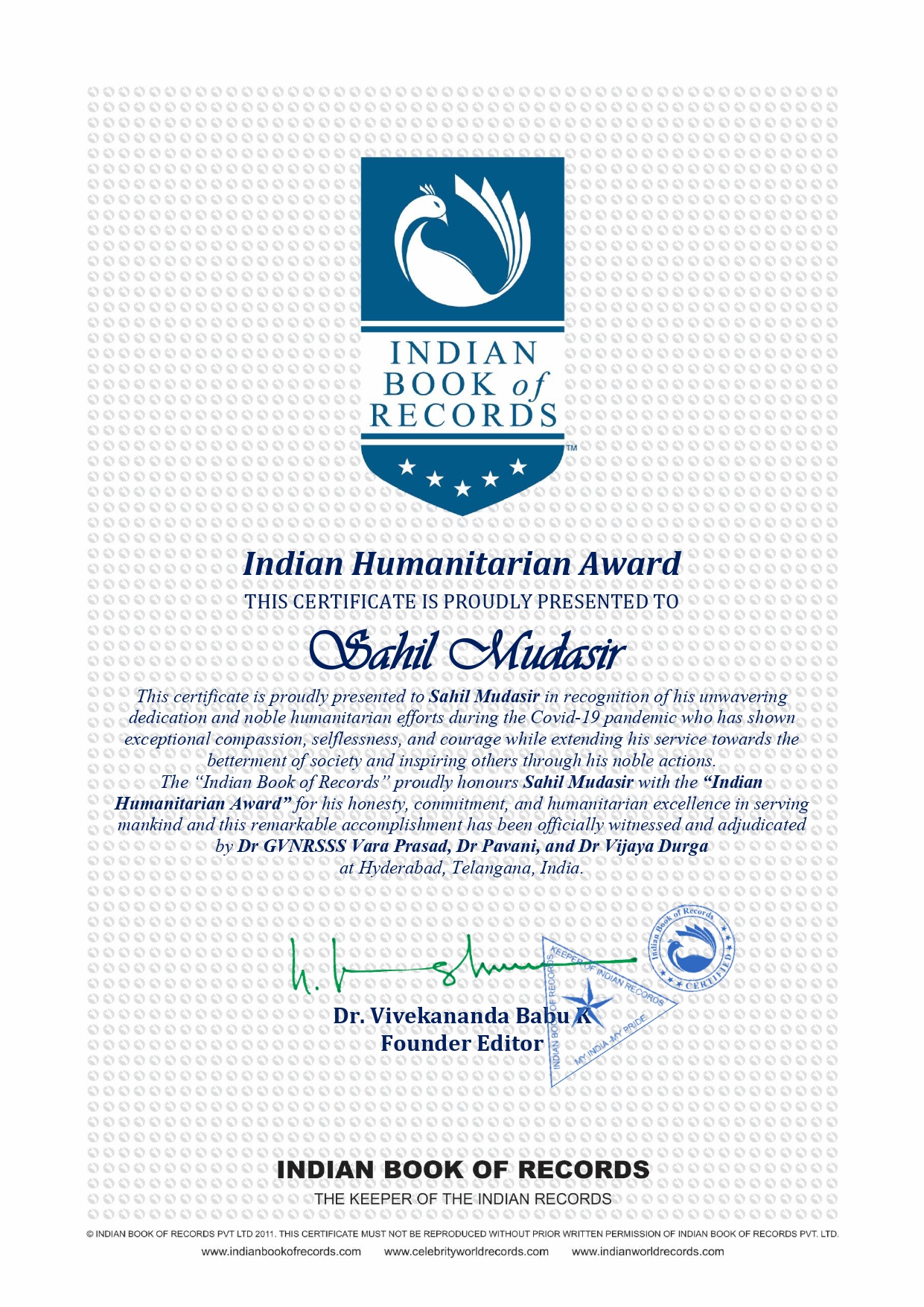 The “Indian Book of Records” proudly honours Sahil Mudasir with the “Indian Humanitarian Award” for his honesty, commitment, and humanitarian excellence in serving mankind and this remarkable accomplishment has been officially witnessed and adjudicated by Dr GVNRSSS Vara Prasad, Dr Pavani, and Dr Vijaya Durga at Hyderabad, Telangana, India.