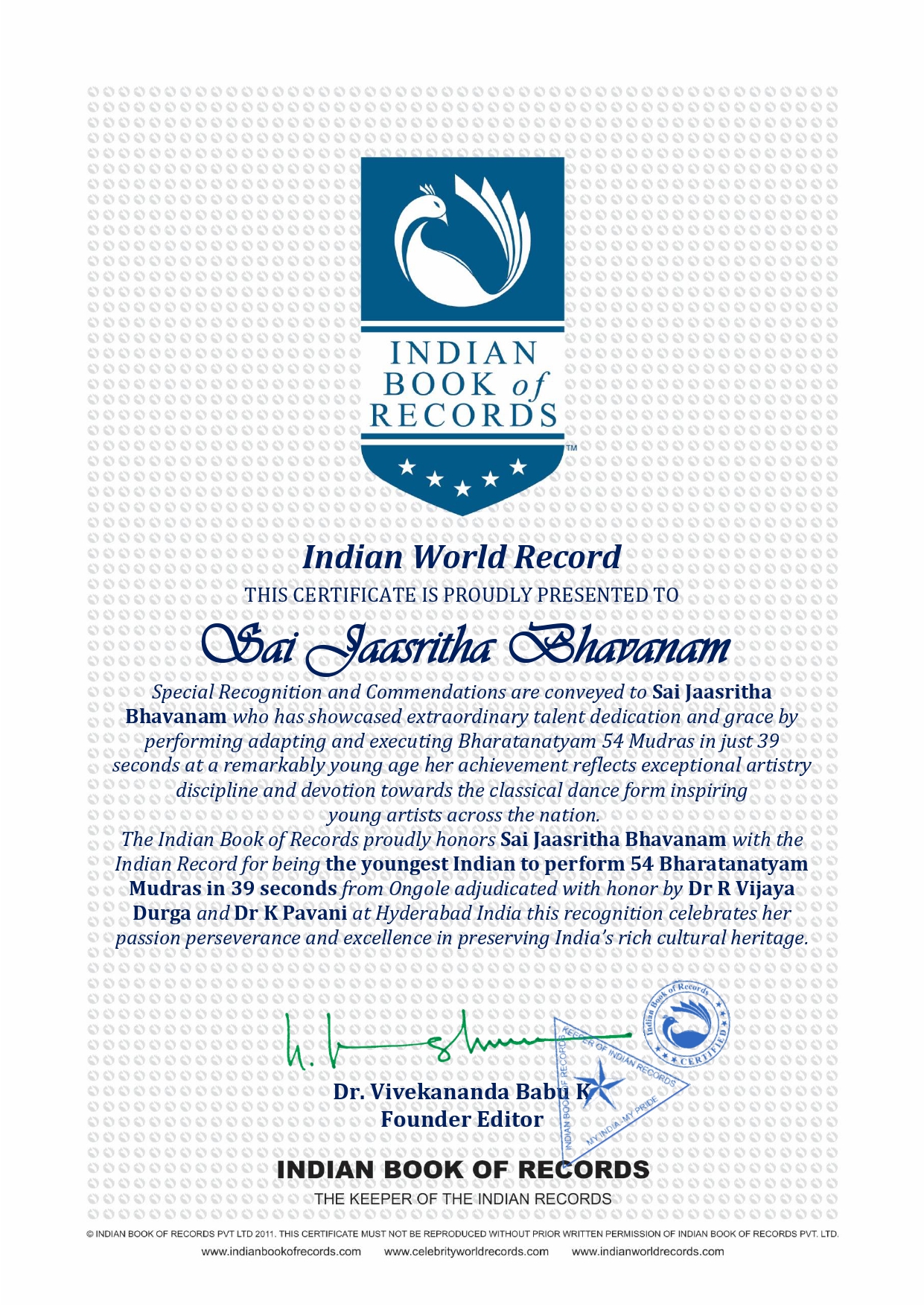 The Indian Book of Records proudly honors Sai Jaasritha Bhavanam with the Indian Record for being the youngest Indian to perform 54 Bharatanatyam Mudras in 39 seconds from Ongole adjudicated with honor by Dr R Vijaya Durga and Dr K Pavani at Hyderabad India this recognition celebrates her passion perseverance and excellence in preserving India’s rich cultural heritage.