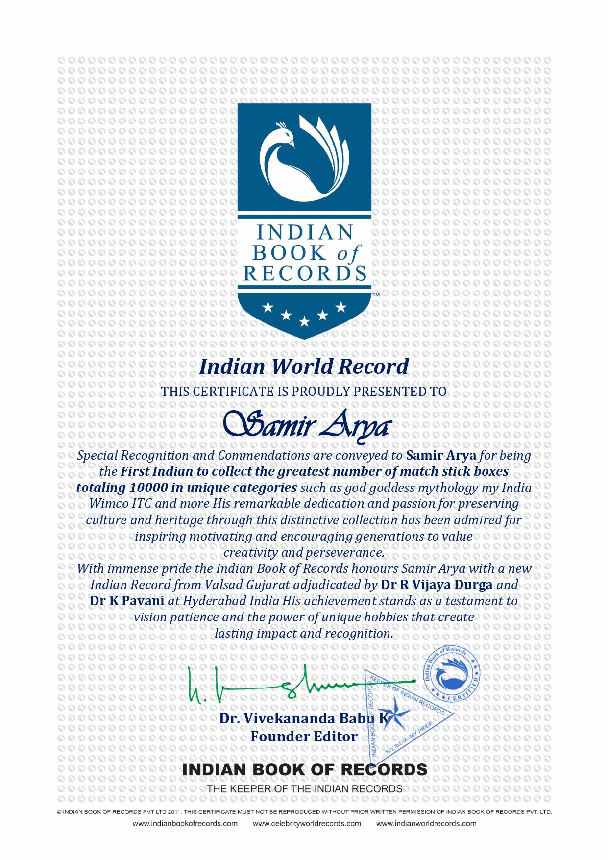 Special Recognition and Commendations are conveyed to Samir Arya for being the First Indian to collect the greatest number of match stick boxes totaling 10000 in unique categories such as god goddess mythology my India Wimco ITC and more His remarkable dedication and passion for preserving culture and heritage through this distinctive collection has been admired for inspiring motivating and encouraging generations to value creativity and perseverance.