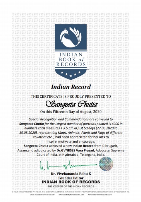 Special recognition and commendations are extended to Sangeeta Chutia for her extraordinary accomplishment of painting a staggering 4,200 portraits each measuring 4 by 5 centimeters within just fifty days showcasing remarkable dedication and artistic finesse as she represented maps animals plants and flags of different countries her work has been widely appreciated for its ability to inspire motivate and encourage budding artists.