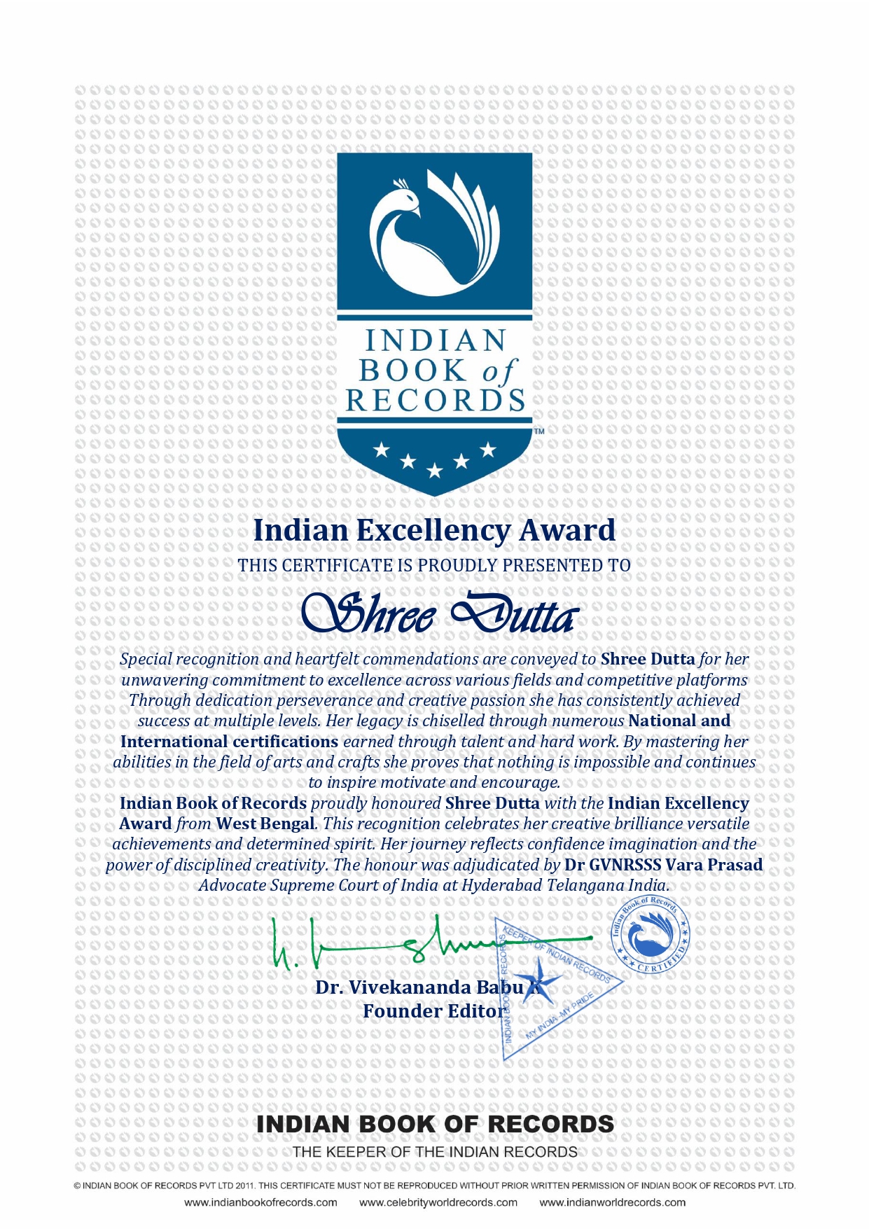 Indian Book of Records proudly honoured Shree Dutta with the Indian Excellency Award from West Bengal This recognition celebrates her creative brilliance versatile achievements and determined spirit Her journey reflects confidence imagination and the power of disciplined creativity The honour was adjudicated by Dr GVNRSSS Vara Prasad Advocate Supreme Court of India at Hyderabad Telangana India.