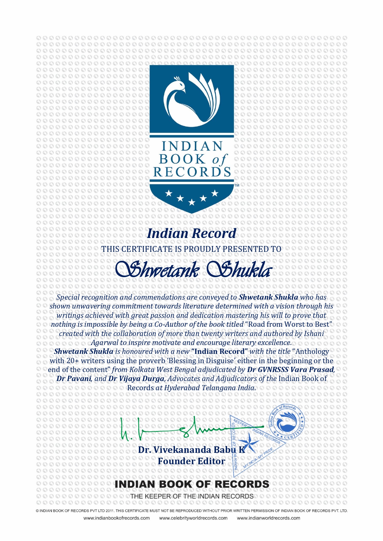 Special recognition and commendations are conveyed to Shwetank Shukla who has shown unwavering commitment towards literature determined with a vision through his writings achieved with great passion and dedication mastering his will to prove that nothing is impossible by being a Co-Author of the book titled “Road from Worst to Best” created with the collaboration of more than twenty writers and authored by Ishani Agarwal to inspire motivate and encourage literary excellence.