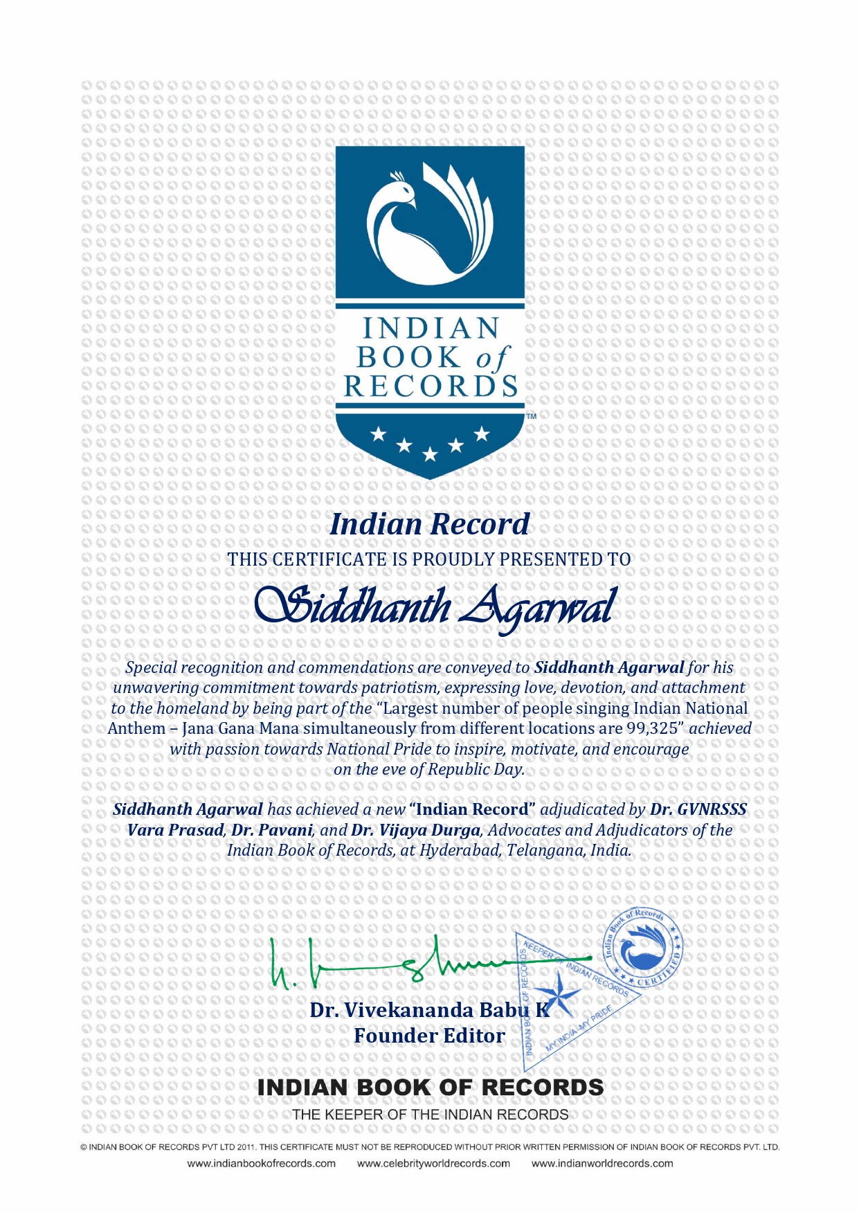 Special recognition and commendations are conveyed to Siddhanth Agarwal for his unwavering commitment towards patriotism, expressing love, devotion, and attachment to the homeland by being part of the “Largest number of people singing Indian National Anthem – Jana Gana Mana simultaneously from different locations are 99,325” achieved with passion towards National Pride to inspire, motivate, and encourage on the eve of Republic Day.