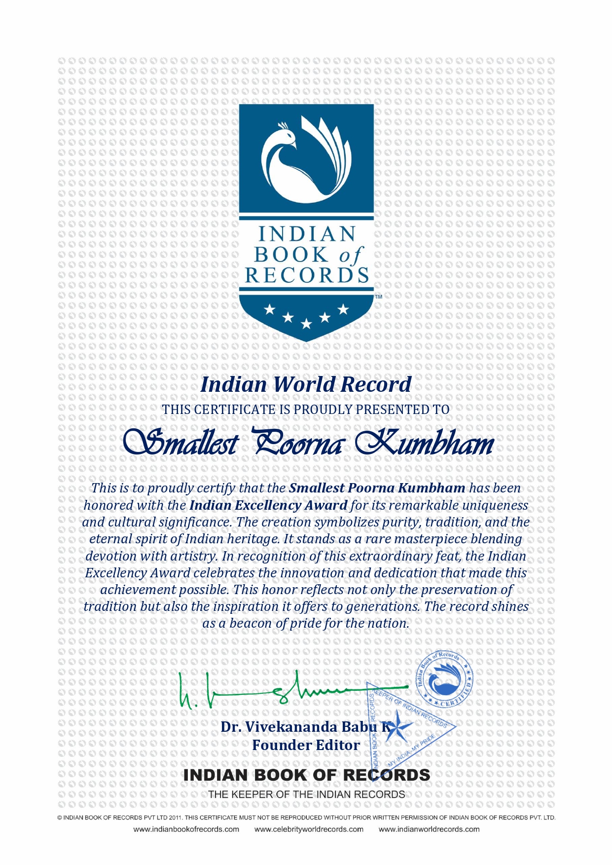 This is to proudly certify that the Smallest Poorna Kumbham has been honored with the Indian Excellency Award for its remarkable uniqueness and cultural significance The creation symbolizes purity, tradition, and the eternal spirit of Indian heritage It stands as a rare masterpiece blending devotion with artistry In recognition of this extraordinary feat.