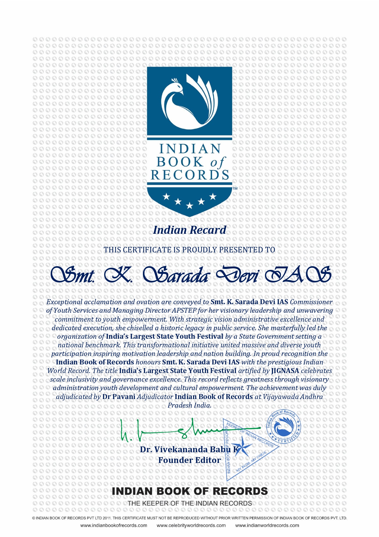 In proud recognition the Indian Book of Records honours Smt K Sarada Devi IAS with the prestigious Indian World Record The title India’s Largest State Youth Festival artified by JIGNASA celebrates scale inclusivity and governance excellence This record reflects greatness through visionary administration youth development and cultural empowerment The achievement was duly adjudicated by Dr Pavani Adjudicator Indian Book of Records at Vijayawada Andhra Pradesh India.