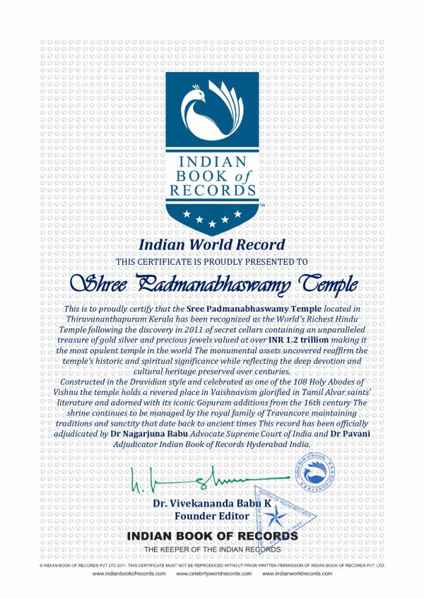 This is to proudly certify that the Sree Padmanabhaswamy Temple located in Thiruvananthapuram Kerala has been recognized as the World’s Richest Hindu Temple following the discovery in 2011 of secret cellars containing an unparalleled treasure of gold silver and precious jewels valued at over INR 1.2 trillion making it the most opulent temple in the world The monumental assets uncovered reaffirm the temple’s historic and spiritual significance while reflecting the deep devotion and cultural heritage preserved over centuries.