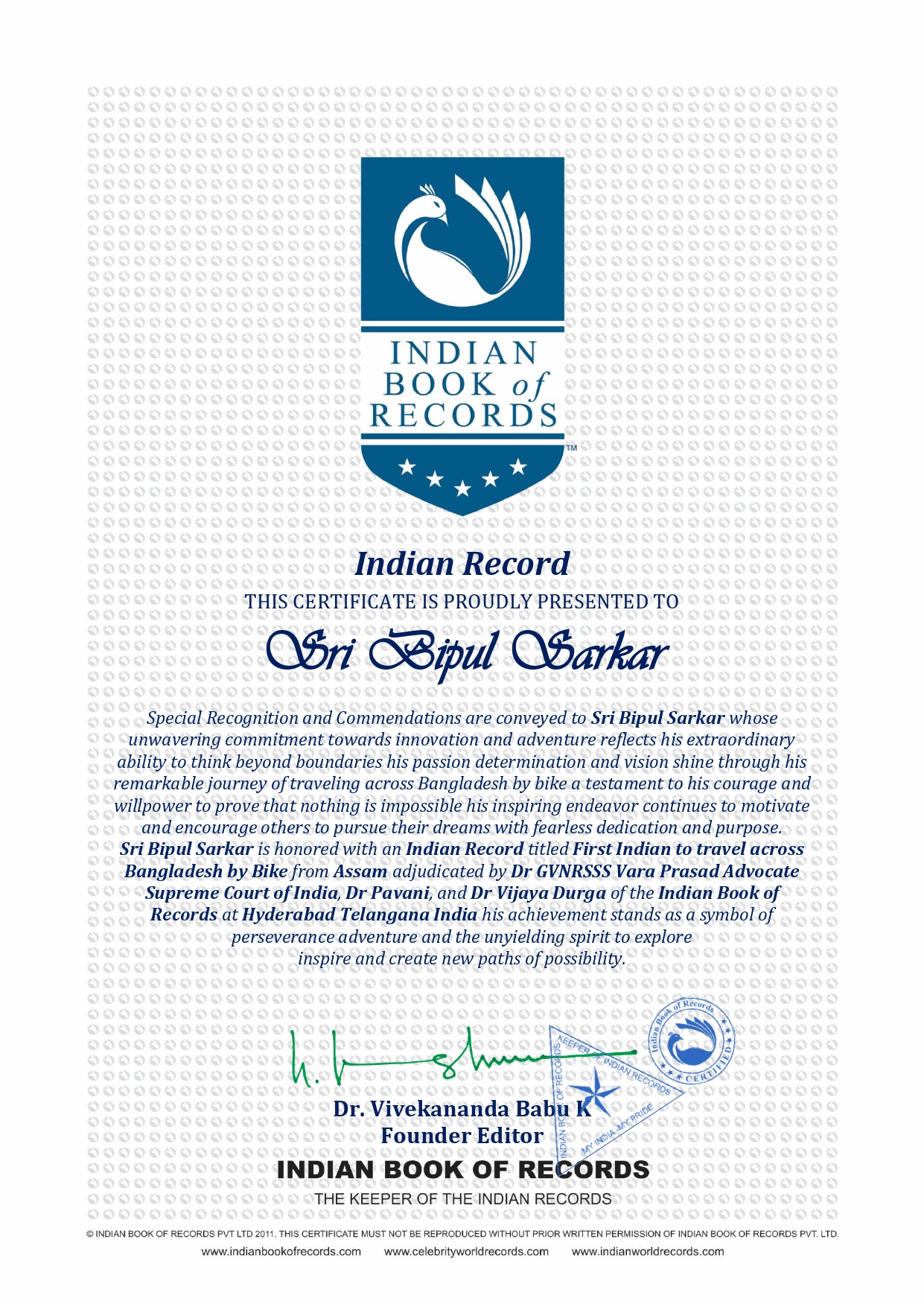 Sri Bipul Sarkar is honored with an Indian Record titled First Indian to travel across Bangladesh by Bike from Assam adjudicated by Dr GVNRSSS Vara Prasad Advocate Supreme Court of India, Dr Pavani, and Dr Vijaya Durga of the Indian Book of Records at Hyderabad Telangana India his achievement stands as a symbol of perseverance adventure and the unyielding spirit to explore inspire and create new paths of possibility.