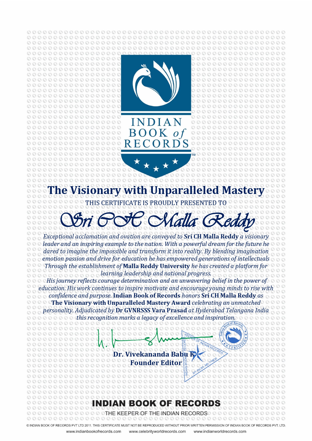 His journey reflects courage determination and an unwavering belief in the power of education His work continues to inspire motivate and encourage young minds to rise with confidence and purpose Indian Book of Records honors Sri CH Malla Reddy as The Visionary with Unparalleled Mastery celebrating an unmatched personality Adjudicated by Dr GVNRSSS Vara Prasad at Hyderabad Telangana India this recognition marks a legacy of excellence and inspiration.