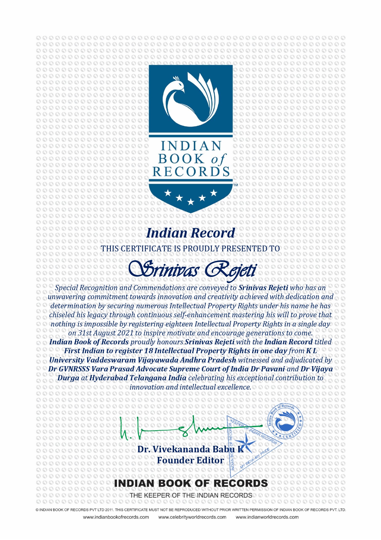 Special Recognition and Commendations are conveyed to Srinivas Rejeti who has an unwavering commitment towards innovation and creativity achieved with dedication and determination by securing numerous Intellectual Property Rights under his name he has chiseled his legacy through continuous self-enhancement mastering his will to prove that nothing is impossible by registering eighteen Intellectual Property Rights in a single day on 31st August 2021 to inspire motivate and encourage generations to come.