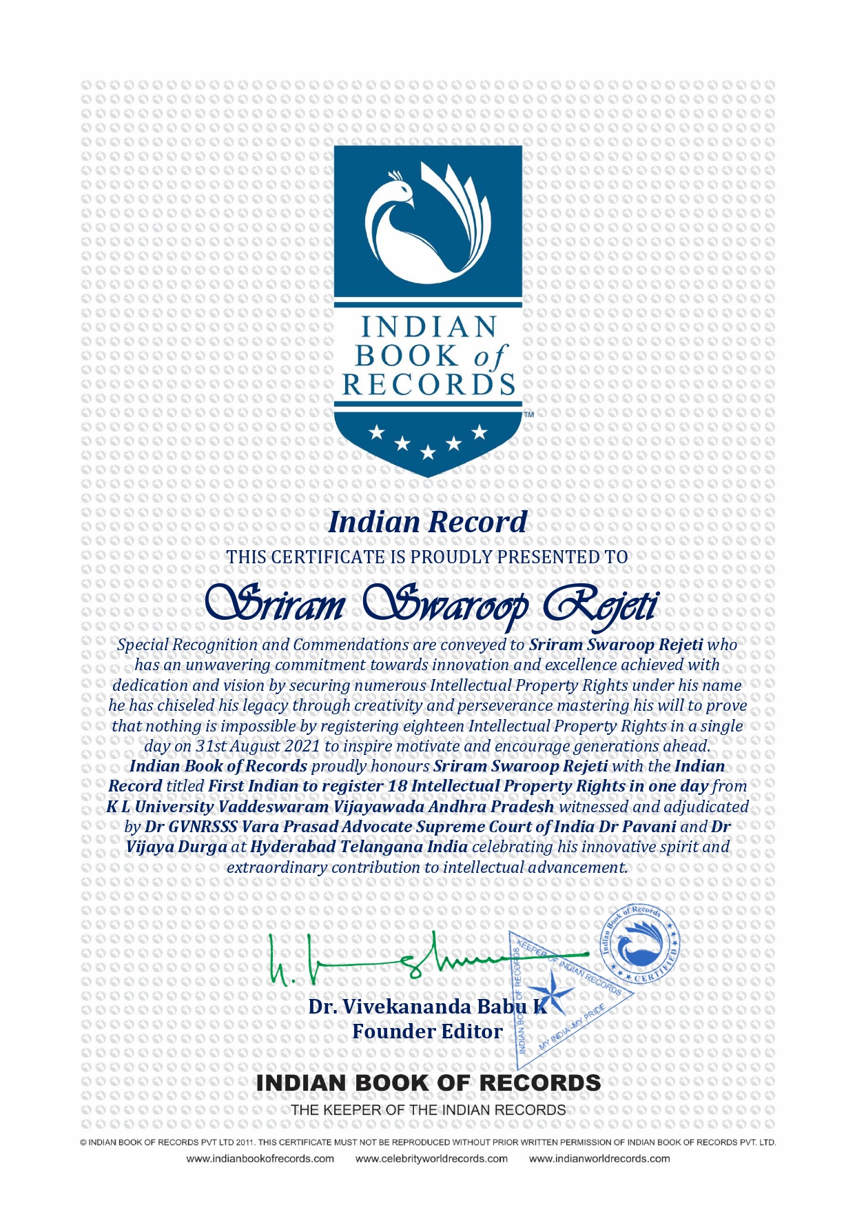 Special Recognition and Commendations are conveyed to Sriram Swaroop Rejeti who has an unwavering commitment towards innovation and excellence achieved with dedication and vision by securing numerous Intellectual Property Rights under his name he has chiseled his legacy through creativity and perseverance mastering his will to prove that nothing is impossible by registering eighteen Intellectual Property Rights in a single day on 31st August 2021 to inspire motivate and encourage generations ahead.