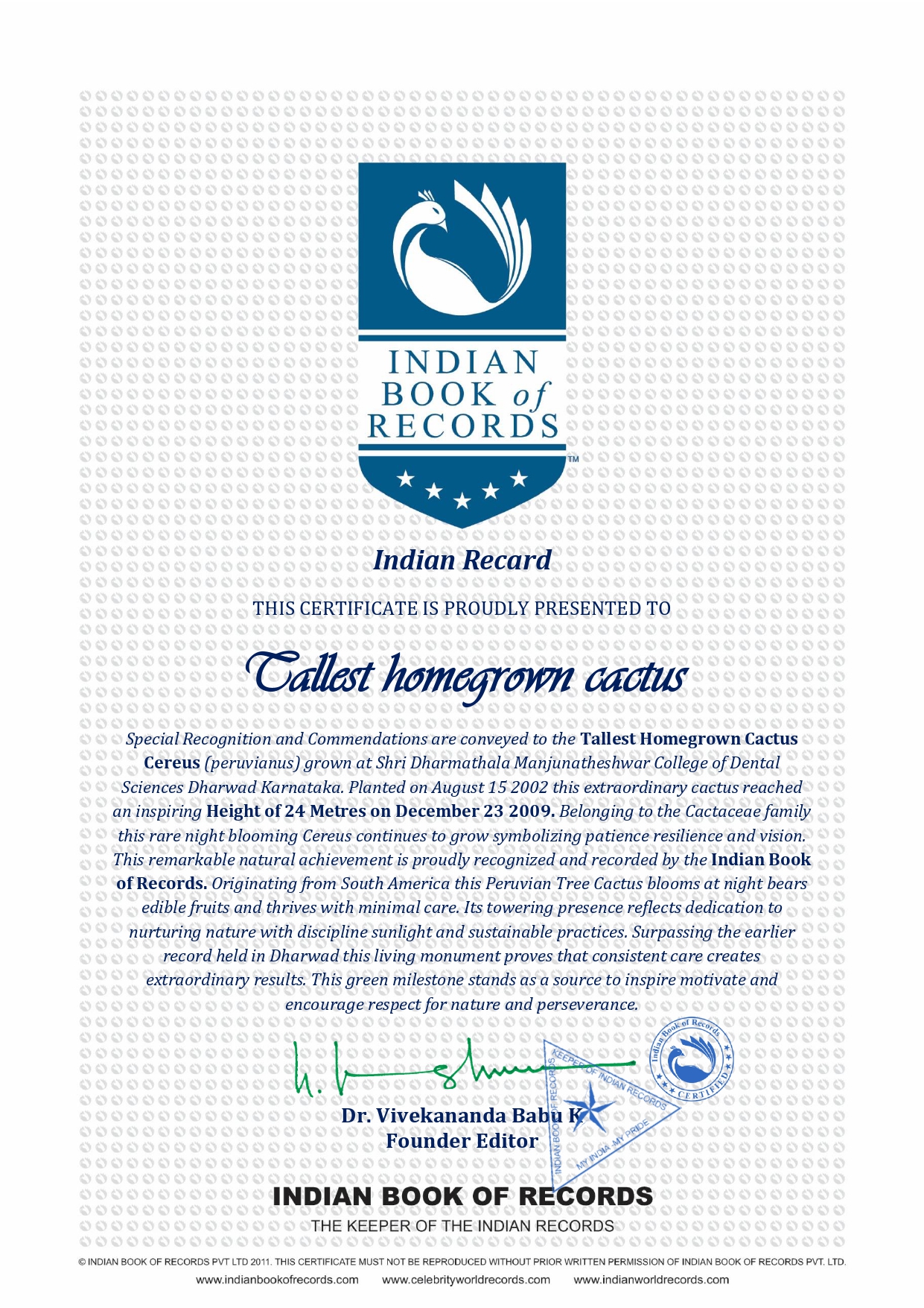 Special Recognition and Commendations are conveyed to the tallest homegrown cactus Cereus peruvianus grown at Shri Dharmathala Manjunatheshwar College of Dental Sciences Dharwad Karnataka Planted on August 15 2002 this extraordinary cactus reached an inspiring height of 24 metres on December 23 2009 Belonging to the Cactaceae family this rare night blooming Cereus continues to grow symbolizing patience resilience and vision This remarkable natural achievement is proudly recognized and recorded by the Indian Book of Records.