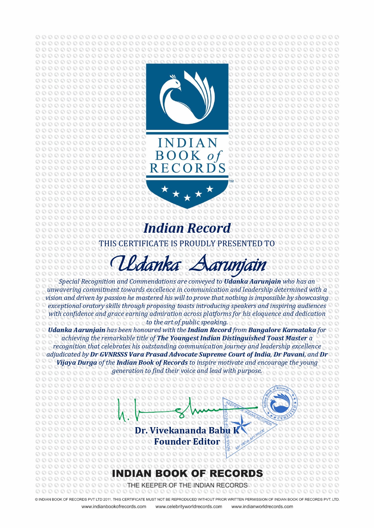 Udanka Aarunjain has been honoured with the Indian Record from Bangalore Karnataka for achieving the remarkable title of The Youngest Indian Distinguished Toast Master a recognition that celebrates his outstanding communication journey and leadership excellence adjudicated by Dr GVNRSSS Vara Prasad Advocate Supreme Court of India, Dr Pavani, and Dr Vijaya Durga of the Indian Book of Records to inspire motivate and encourage the young generation to find their voice and lead with purpose.