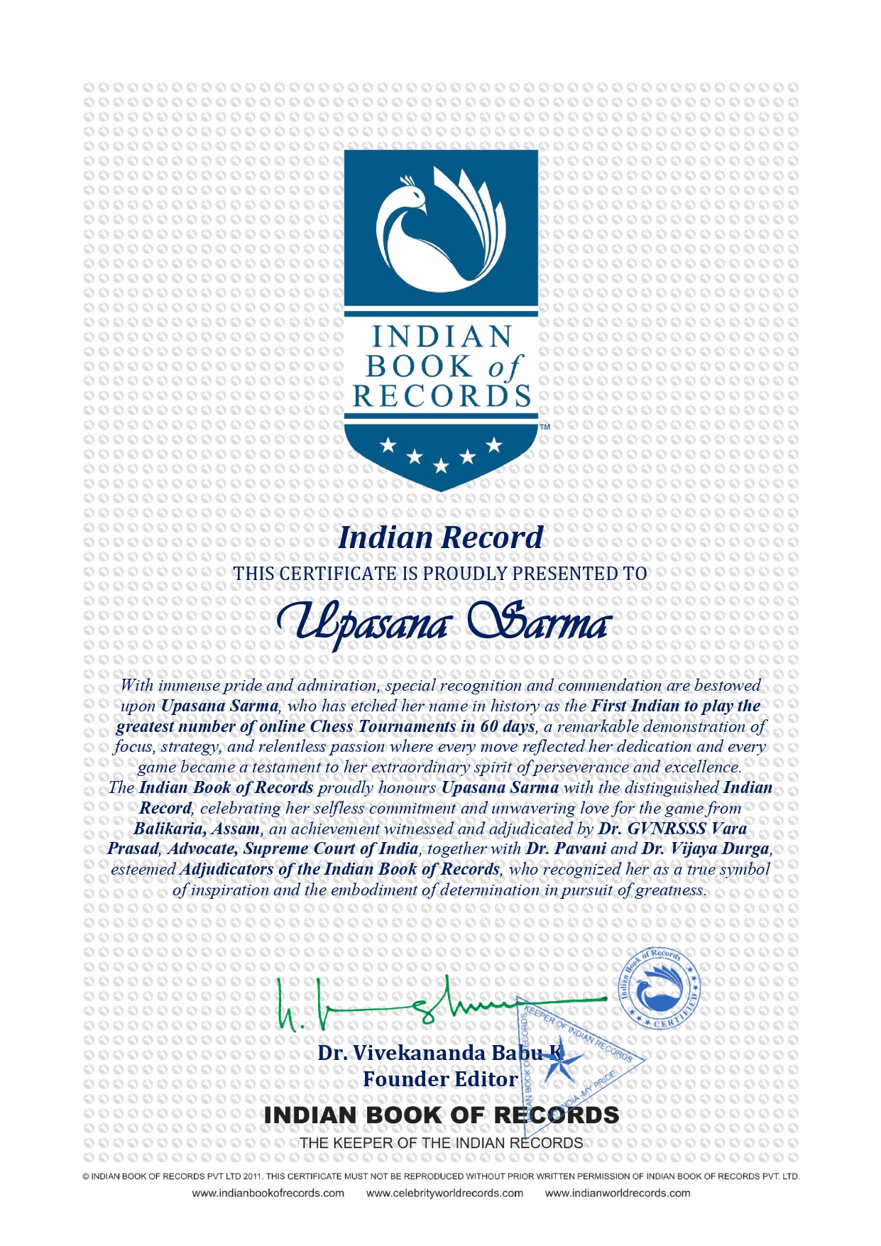With immense pride and admiration, special recognition and commendation are bestowed upon Upasana Sarma, who has etched her name in history as the First Indian to play the greatest number of online Chess Tournaments in 60 days, a remarkable demonstration of focus, strategy, and relentless passion where every move reflected her dedication and every game became a testament to her extraordinary spirit of perseverance and excellence.