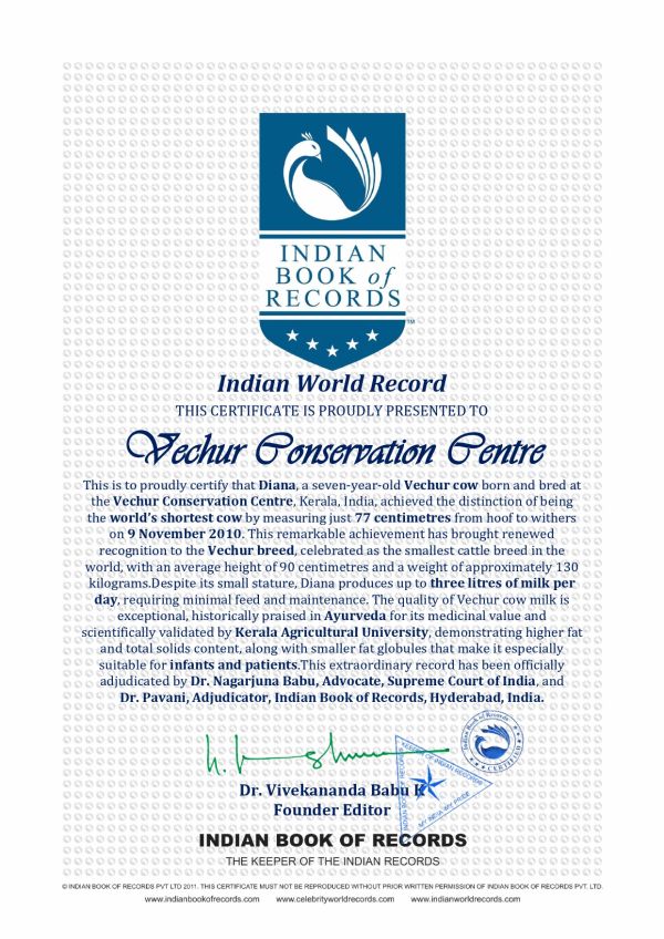 The world’s shortest cow is Diana a seven year old Vechur cow born and bred at the Vechur Conservation Centre in Kerala India who on 9 November 2010 measured just 77 centimetres from hoof to withers this rare achievement brought renewed attention to the Vechur breed celebrated as the smallest cattle breed in the world with an average height of 90 centimetres and a weight of about 130 kilograms.