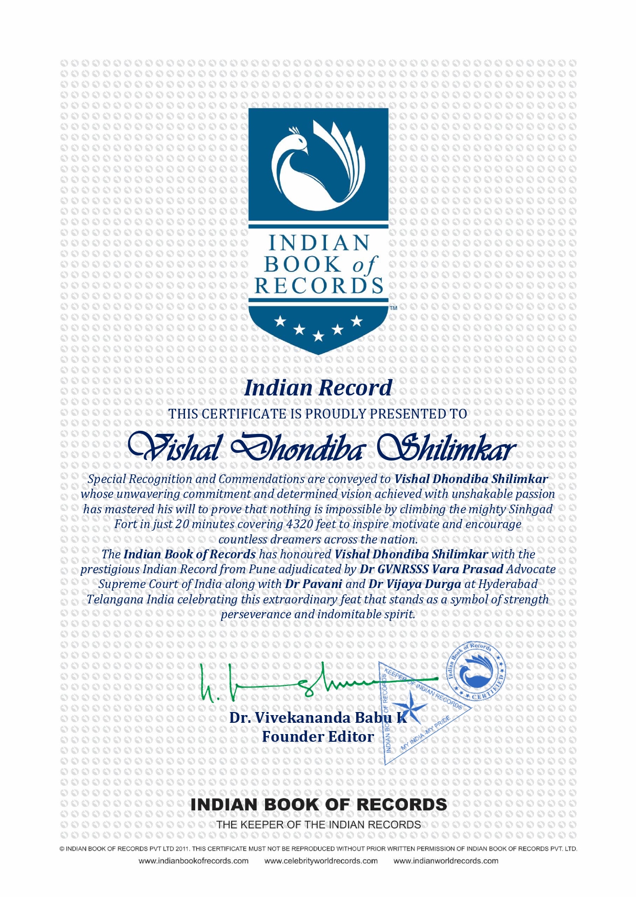 Special Recognition and Commendations are conveyed to Vishal Dhondiba Shilimkar whose unwavering commitment and determined vision achieved with unshakable passion has mastered his will to prove that nothing is impossible by climbing the mighty Sinhgad Fort in just 20 minutes covering 4320 feet to inspire motivate and encourage countless dreamers across the nation.