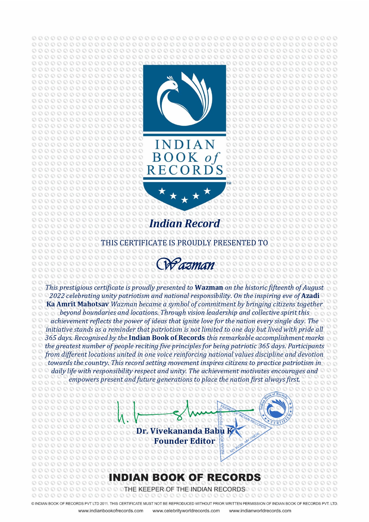This prestigious certificate is proudly presented to Wazman on the historic fifteenth of August 2022 celebrating unity patriotism and national responsibility On the inspiring eve of Azadi Ka Amrit Mahotsav Wazman became a symbol of commitment by bringing citizens together beyond boundaries and locations Through vision leadership and collective spirit this achievement reflects the power of ideas that ignite love for the nation every single day The initiative stands as a reminder that patriotism is not limited to one day but lived with pride all 365 days.