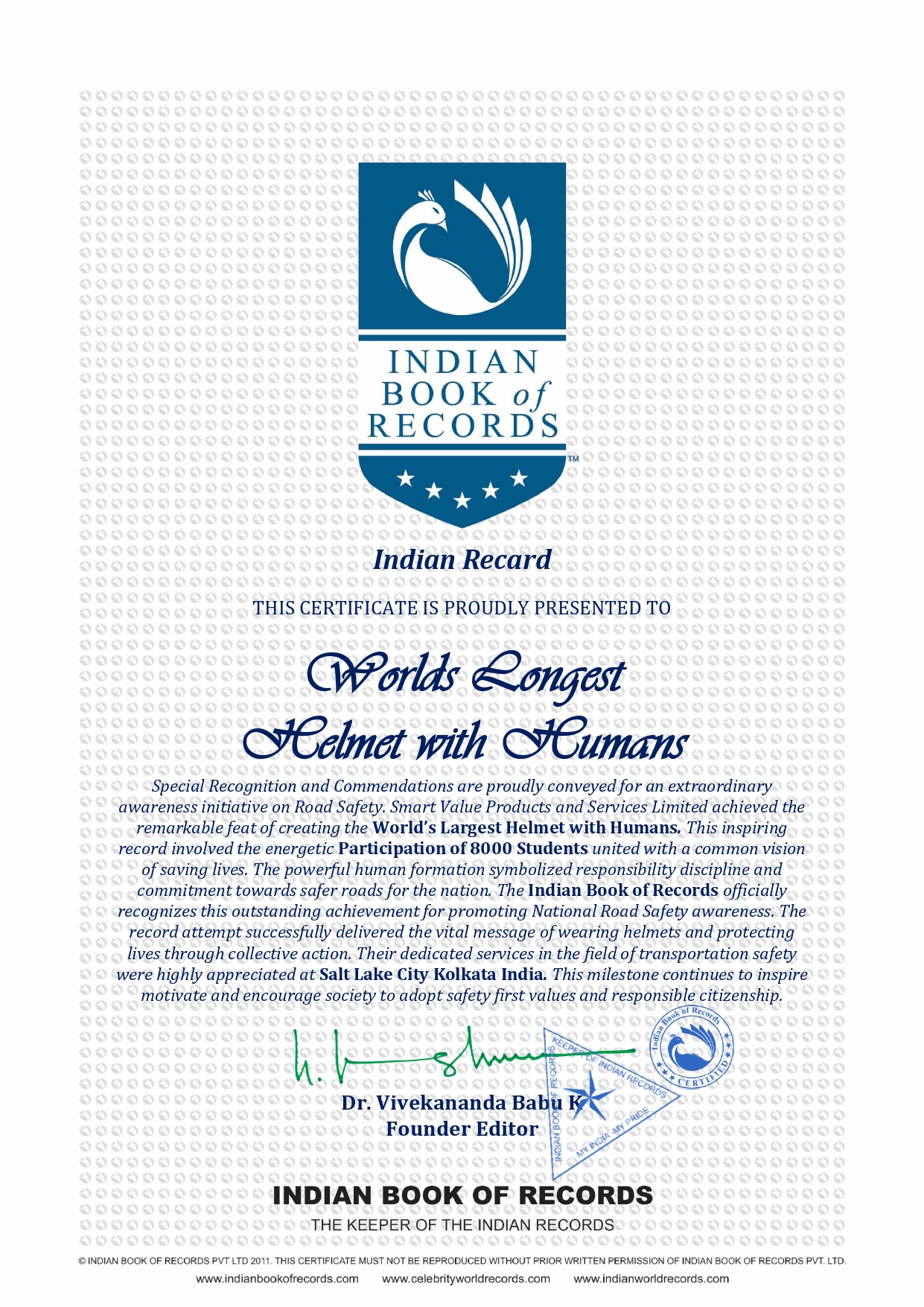 Special Recognition and Commendations are proudly conveyed for an extraordinary awareness initiative on Road Safety Smart Value Products and Services Limited achieved the remarkable feat of creating the Worlds Largest Helmet with Humans This inspiring record involved the energetic participation of 8000 students united with a common vision of saving lives The powerful human formation symbolized responsibility discipline and commitment towards safer roads for the nation.