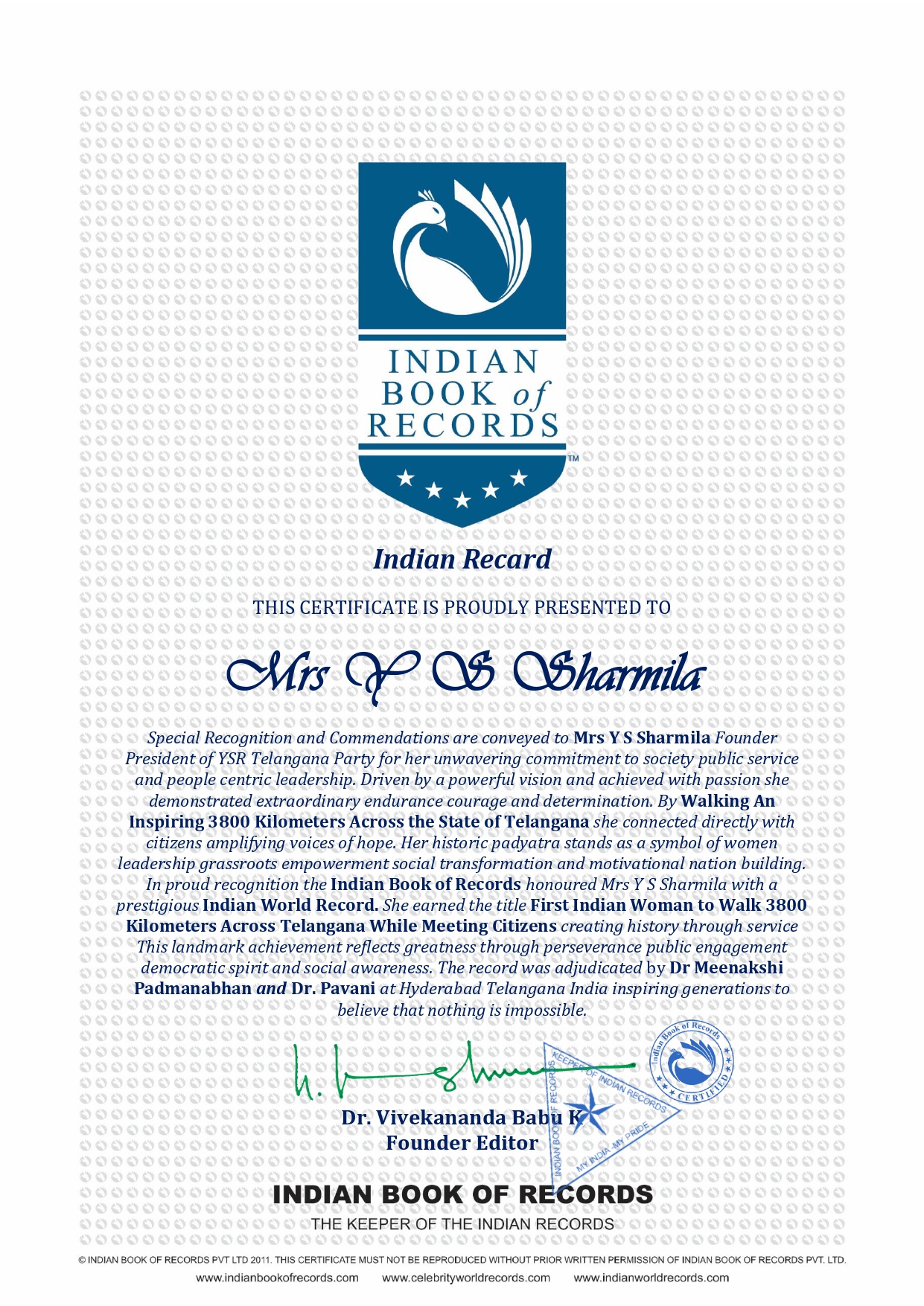 Special Recognition and Commendations are conveyed to Mrs Y S Sharmila Founder President of YSR Telangana Party for her unwavering commitment to society public service and people centric leadership Driven by a powerful vision and achieved with passion she demonstrated extraordinary endurance courage and determination By walking an inspiring 3800 kilometers across the State of Telangana she connected directly with citizens amplifying voices of hope Her historic padyatra stands as a symbol of women leadership grassroots empowerment social transformation and motivational nation building.