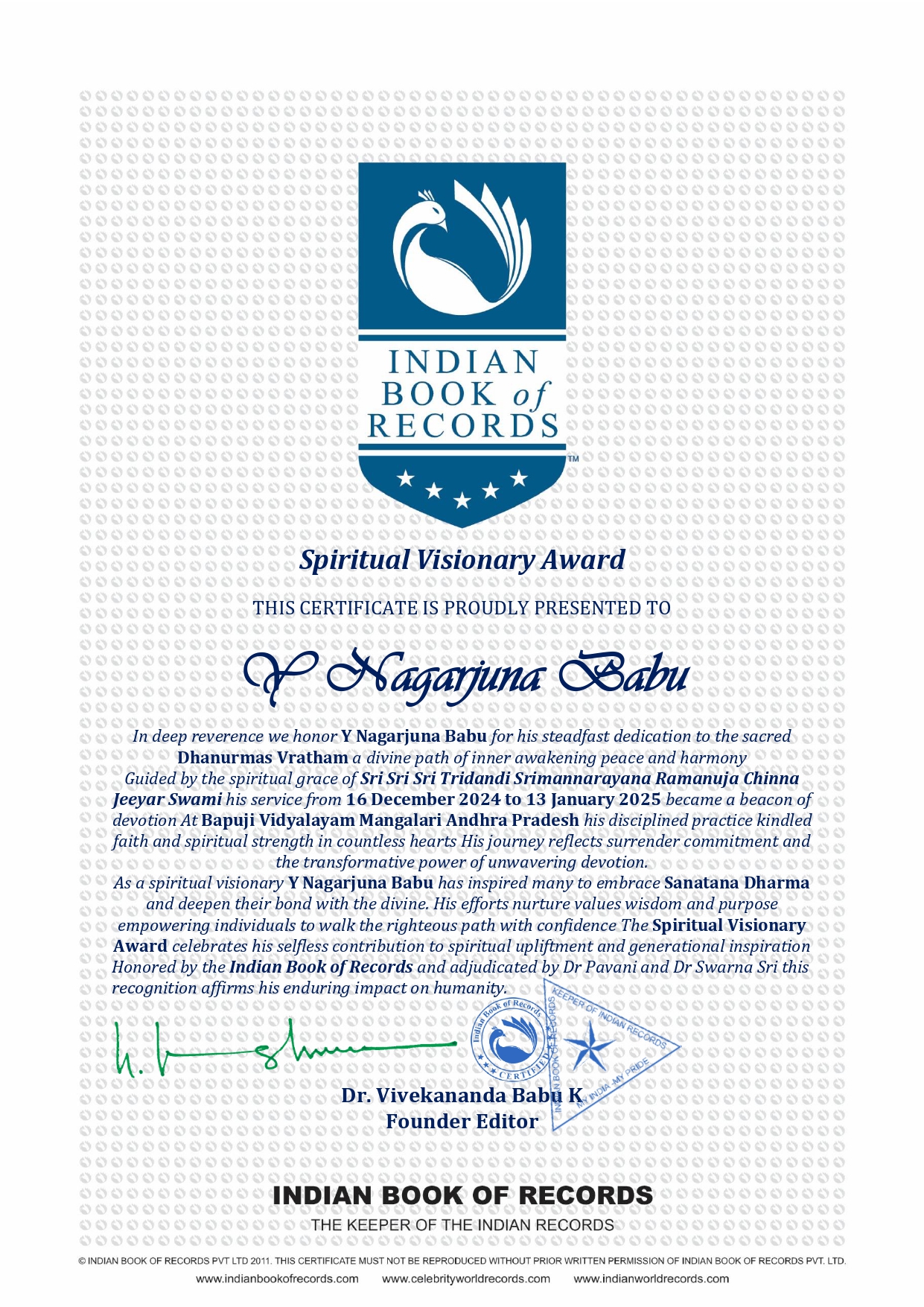 In deep reverence we honor Y Nagarjuna Babu for his steadfast dedication to the sacred Dhanurmas Vratham a divine path of inner awakening peace and harmony Guided by the spiritual grace of Sri Sri Sri Tridandi Srimannarayana Ramanuja Chinna Jeeyar Swami his service from 16 December 2024 to 13 January 2025 became a beacon of devotion At Bapuji Vidyalayam Mangalari Andhra Pradesh his disciplined practice kindled faith and spiritual strength in countless hearts His journey reflects surrender commitment and the transformative power of unwavering devotion.