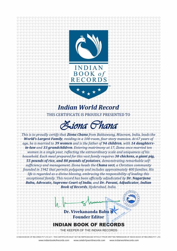 The world’s largest family resides in a 100 room four story mansion in Baktawang Mizoram under the leadership of Ziona Chana who at 67 is married to 39 women and is the father of 94 children with 14 daughters in law and 33 grandchildren Chana who entered matrimony at the age of 17 has wives ranging from 70 to 31 years of age and once married ten women in a single year reflecting the extraordinary scale of his household life which requires massive quantities of food including 30 chickens a giant pig 55 pounds of rice and 88 pounds of potatoes for each meal prepared for the family.