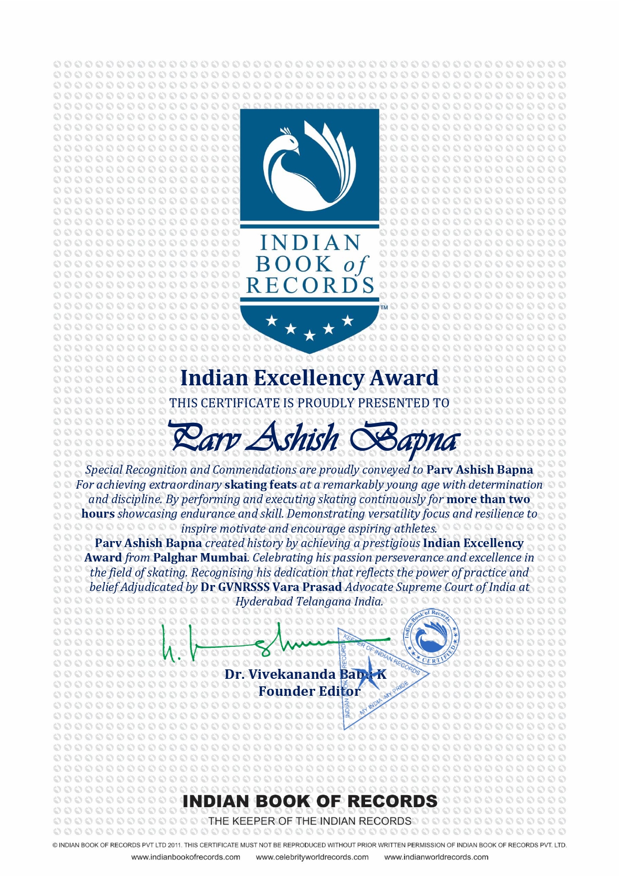 Parv Ashish Bapna created history by achieving a prestigious Indian Record from Palghar Mumbai Celebrating his passion perseverance and excellence in the field of skating Recognising his dedication that reflects the power of practice and belief Adjudicated by Dr GVNRSSS Vara Prasad Advocate Supreme Court of India at Hyderabad Telangana India.
