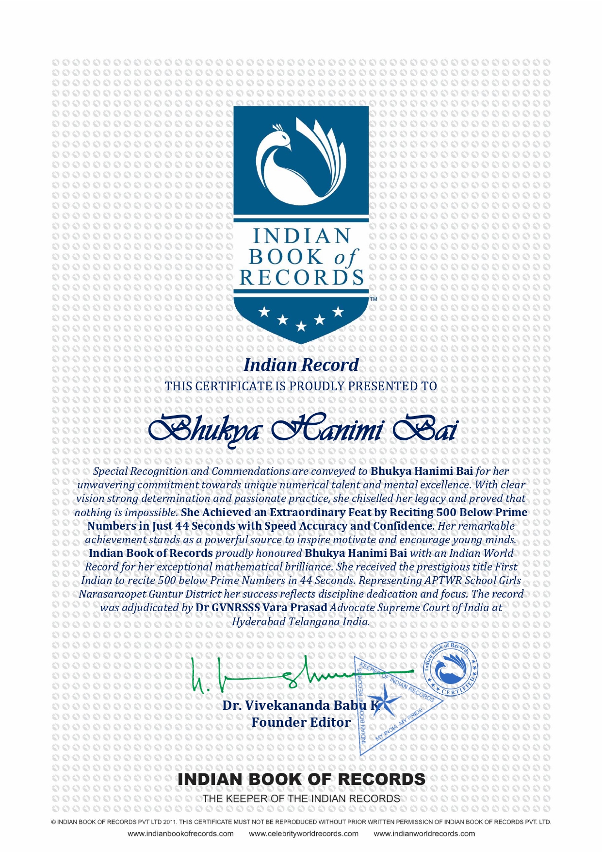 Indian Book of Records proudly honoured Bhukya Hanimi Bai with an Indian World Record for her exceptional mathematical brilliance She received the prestigious title First Indian to recite 500 below Prime Numbers in 44 Seconds Representing APTWR School Girls Narasaraopet Guntur District her success reflects discipline dedication and focus The record was adjudicated by Dr GVNRSSS Vara Prasad Advocate Supreme Court of India at Hyderabad Telangana India.