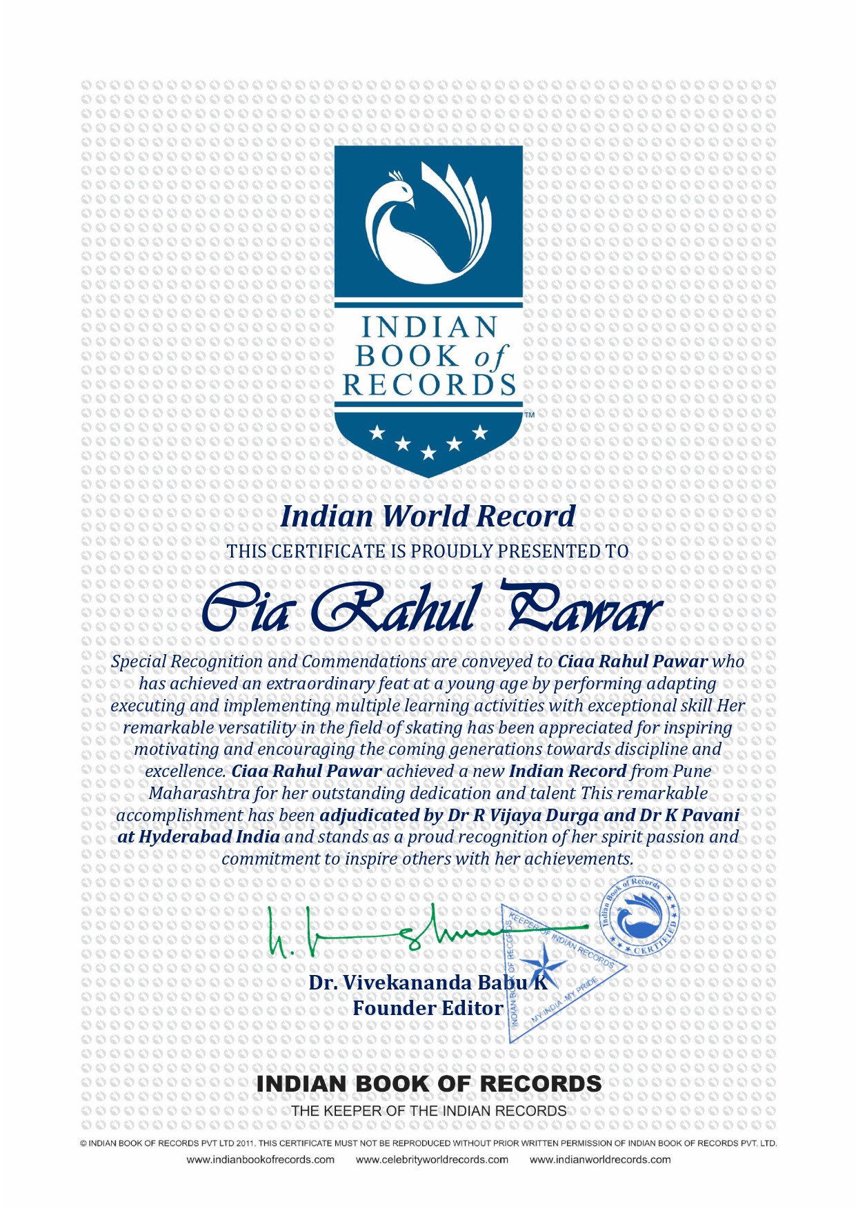 Ciaa Rahul Pawar achieved a new Indian Record from Pune Maharashtra for her outstanding dedication and talent This remarkable accomplishment has been adjudicated by Dr R Vijaya Durga and Dr K Pavani at Hyderabad India and stands as a proud recognition of her spirit passion and commitment to inspire others with her achievements.