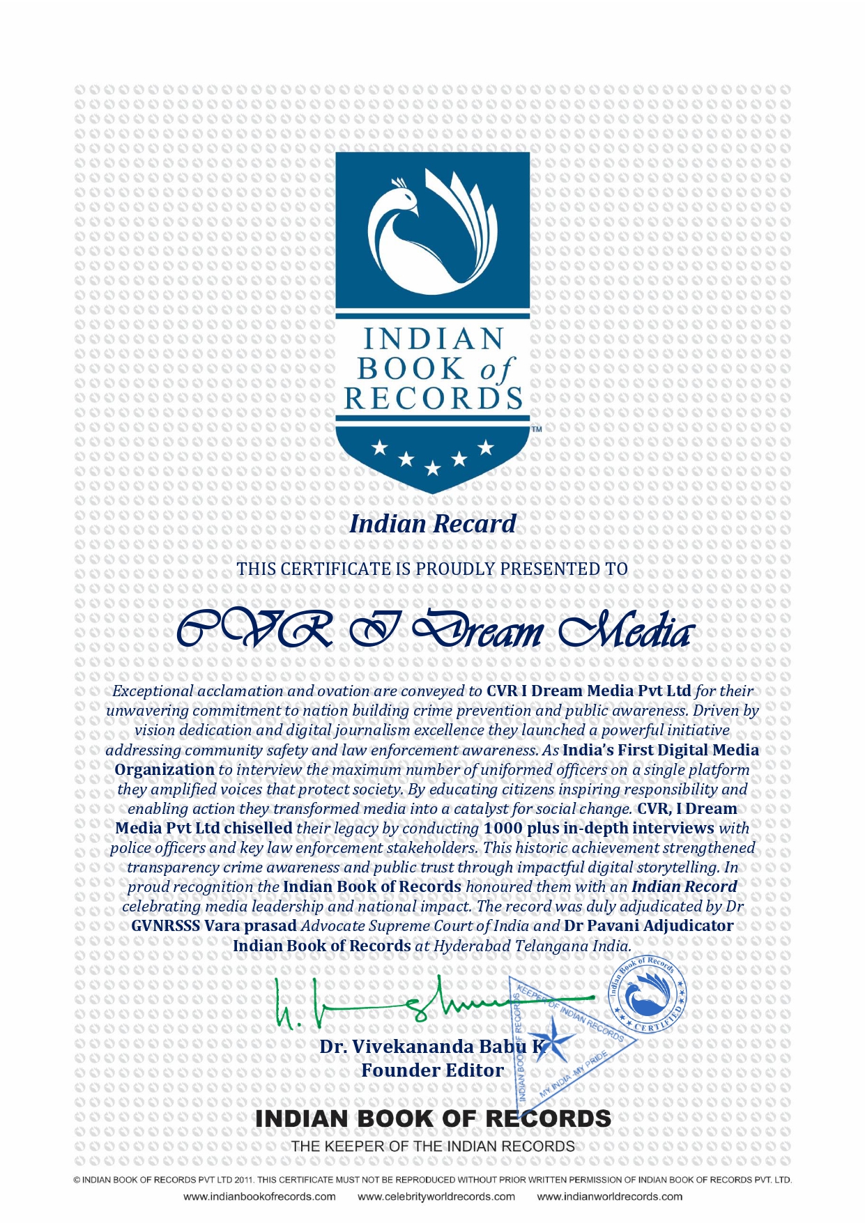 CVR I Dream Media Pvt Ltd chiselled their legacy by conducting 1000 plus in depth interviews with police officers and key law enforcement stakeholders This historic achievement strengthened transparency crime awareness and public trust through impactful digital storytelling In proud recognition the Indian Book of Records honoured them with an Indian Record celebrating media leadership and national impact The record was duly adjudicated by Dr GVNRSSS Varaprasad Advocate Supreme Court of India and Dr Pavani Adjudicator Indian Book of Records at Hyderabad Telangana India.