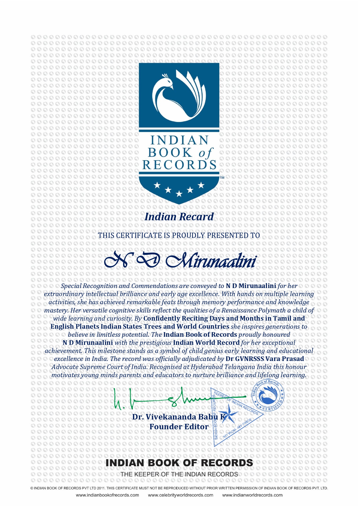 The Indian Book of Records proudly honoured Mehak Kohli with the prestigious Indian World Record title She is recognised as the Youngest Indian Girl to Teach Calligraphy representing creativity youth empowerment and skill based education This remarkable achievement from Ambala Cantt Haryana highlights dedication to fine arts and calligraphy training in India The record was adjudicated by Dr GVNRSSS Vara Prasad Advocate Supreme Court of India at Hyderabad Telangana India.